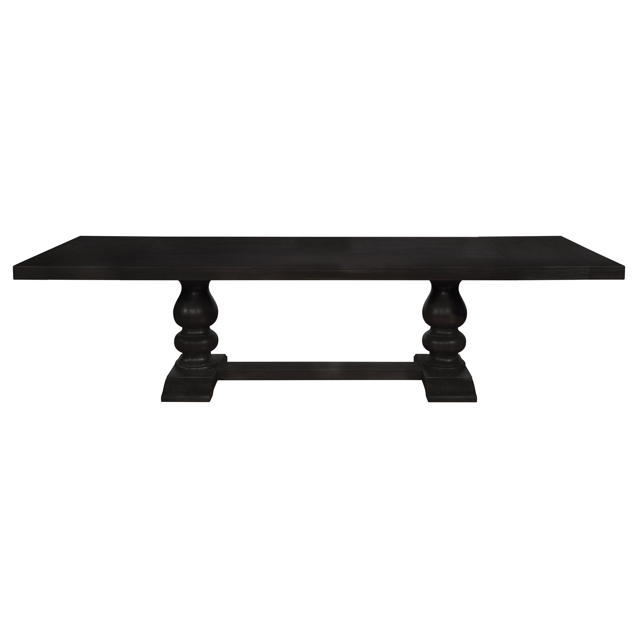 Celebrate a curvy, dramatic silhouette that adds an artful elegance to a formal space. This formal dining table offers a lush antique noir finish wood construction with a polished aesthetic. Its trestle-style base reflects sensual tapering and supports beautifully turned legs. Embrace a chunky profile that offers a solid look and feel. This elegant table is extra-long and ideal for a formal dining room. Key Features: • Rectangular dining table with oversized top and traditional trestle-style silhouette • Distressed noir finish enhances the vintage character and woodgrain detail • Double pedestal base features turned baluster-style legs for classic appeal • Includes two fourteen-inch end leaves to extend seating capacity to ten • Thick tabletop profile contributes to the table’s substantial visual weight • Crafted from solid hardwood, engineered wood, and acacia veneer throughout