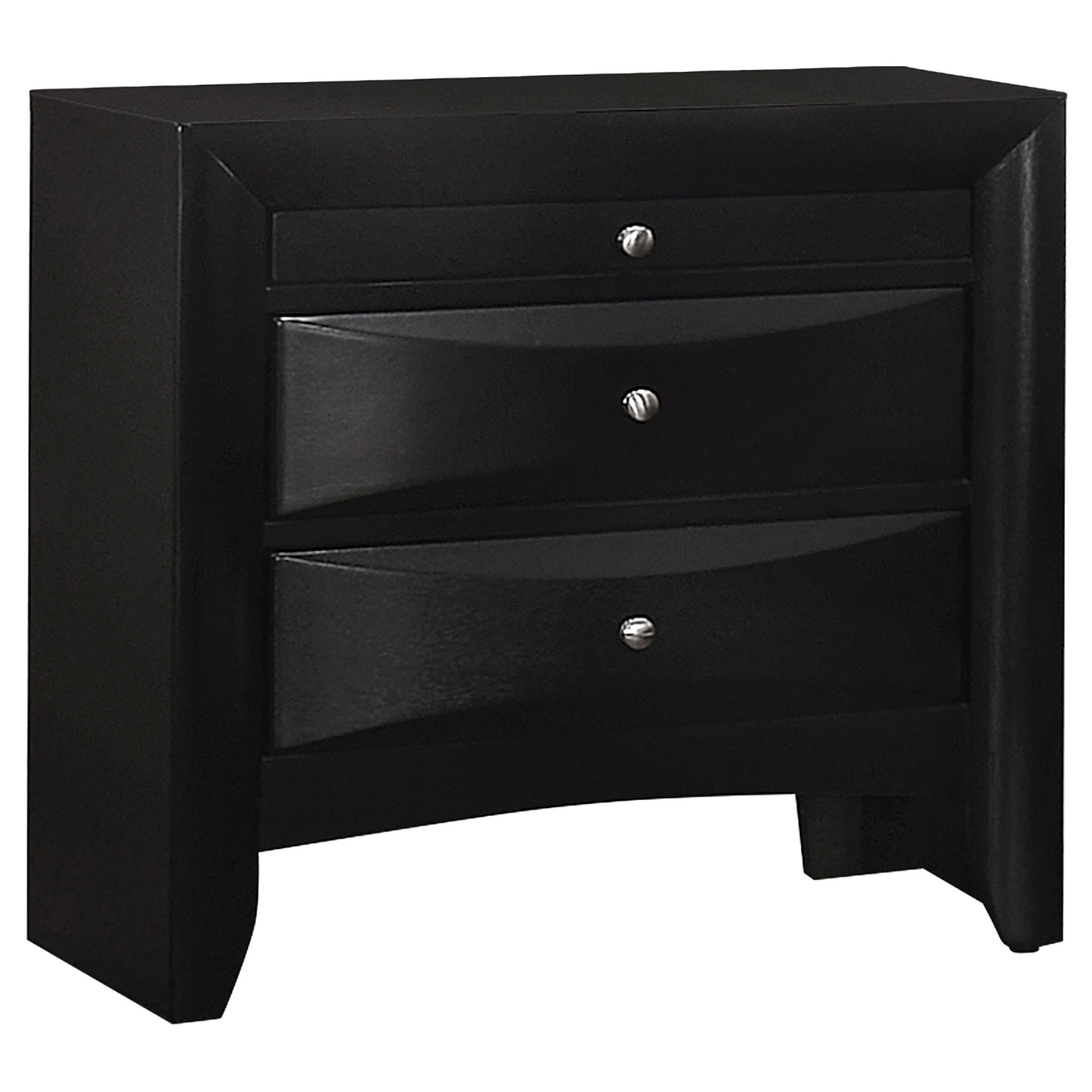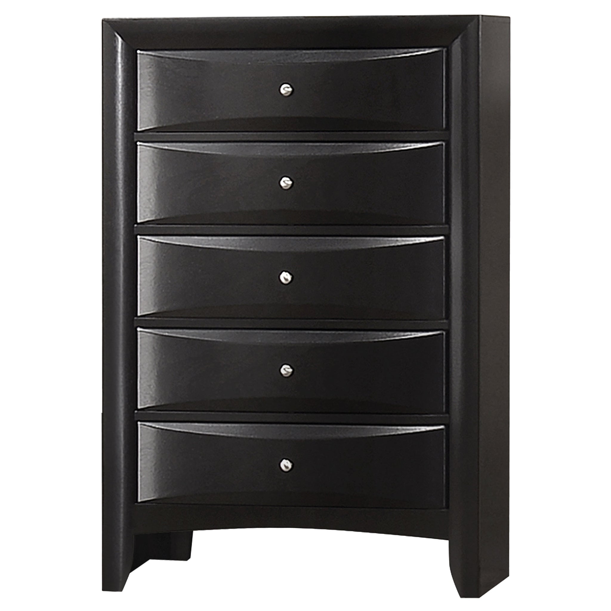 Transform your bedroom with this sophisticated storage bedroom set that combines timeless style and practical function. Finished in sleek black, the platform bed features four drawers in the footboard and hidden compartments behind drop-down doors on the headboard and side rails. The bookcase headboard includes four drawers and a center shelf for accessible storage. Complementary case pieces echo the look with chambered drawer fronts and brushed nickel hardware, creating a refined and cohesive space. Key Features: • Four-piece queen bedroom set with refined transitional styling • Platform bed includes four footboard drawers for added storage • Drop-down doors on headboard and side provide hidden compartments • Bookcase headboard with four drawers and open center display shelf • Chambered drawer fronts enhance texture and dimensional character • Brushed nickel hardware contrasts beautifully with the black finish