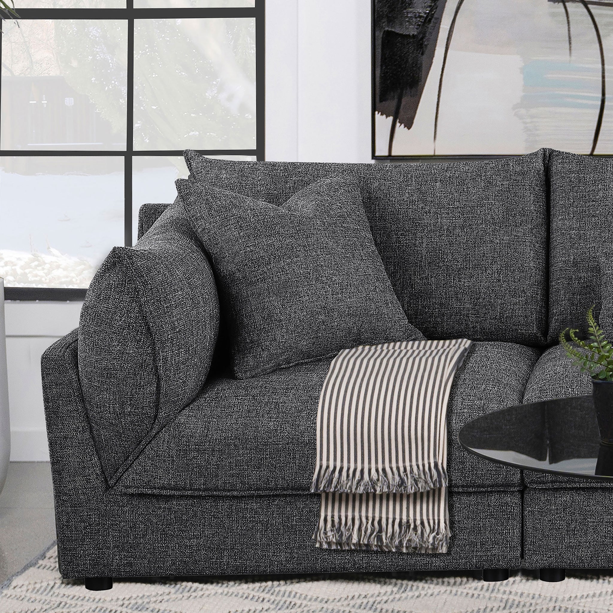 Complete your modular sectional with this left arm facing (LAF) chair, offering both style and comfort to your living room. The barely black fabric upholstery adds a dramatic yet versatile appeal, seamlessly blending with contemporary decor. Filled with foam and feathers, this chair provides plush seating that invites relaxation. Its sturdy pine wood and plywood construction ensures lasting durability, while the left armrest design is perfect for customizing your sectional layout. Removable back and seat cushions enhance comfort and make maintenance a breeze, allowing you to enjoy your sectional to the fullest.