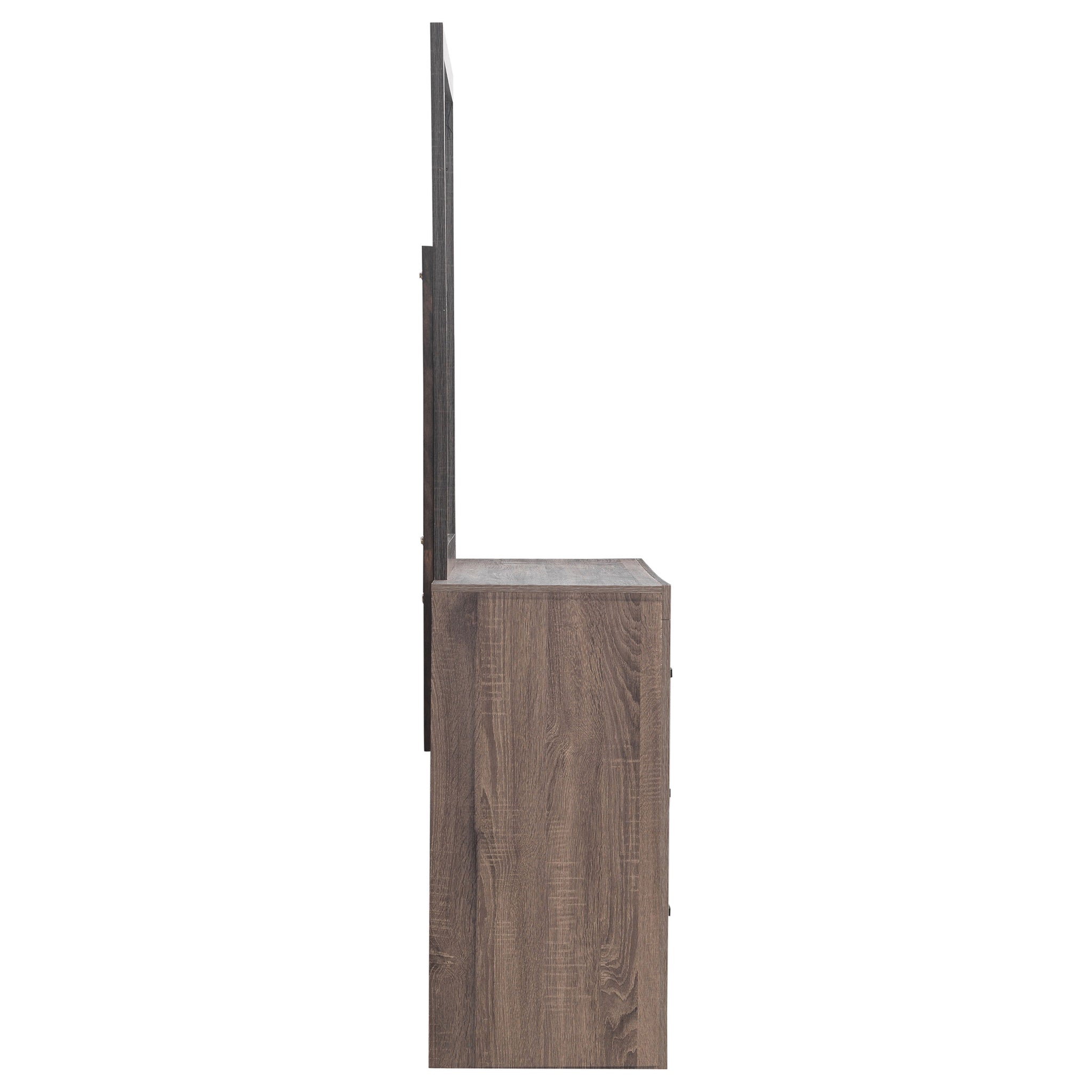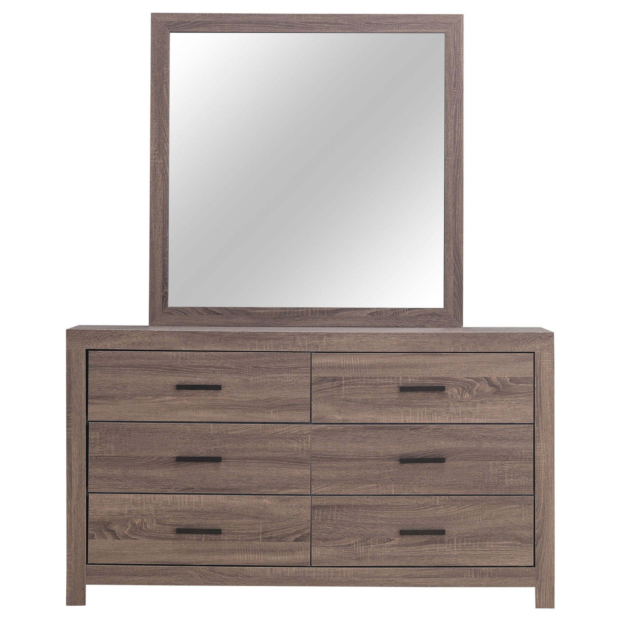 This dresser and mirror set offers a blend of modern design and practical storage. The six-drawer dresser provides ample space for clothing and essentials, while the matching mirror enhances depth and brightness in any room. Crafted from engineered wood with a durable laminate veneer, this set is built for long-term use. Matte dark bronze handles contrast against the sleek frame, adding a refined touch to its contemporary aesthetic. Key Features: • Dresser and mirror set with a sleek, modern silhouette and clean lines • Barrel oak finish enhances the warm, natural wood grain aesthetic • Six spacious drawers provide ample storage for clothing and essentials • Sturdy engineered wood construction ensures lasting durability • Matte dark bronze handles add a stylish contrast to the frame • Durable laminate veneer resists scratches, stains, and everyday wear