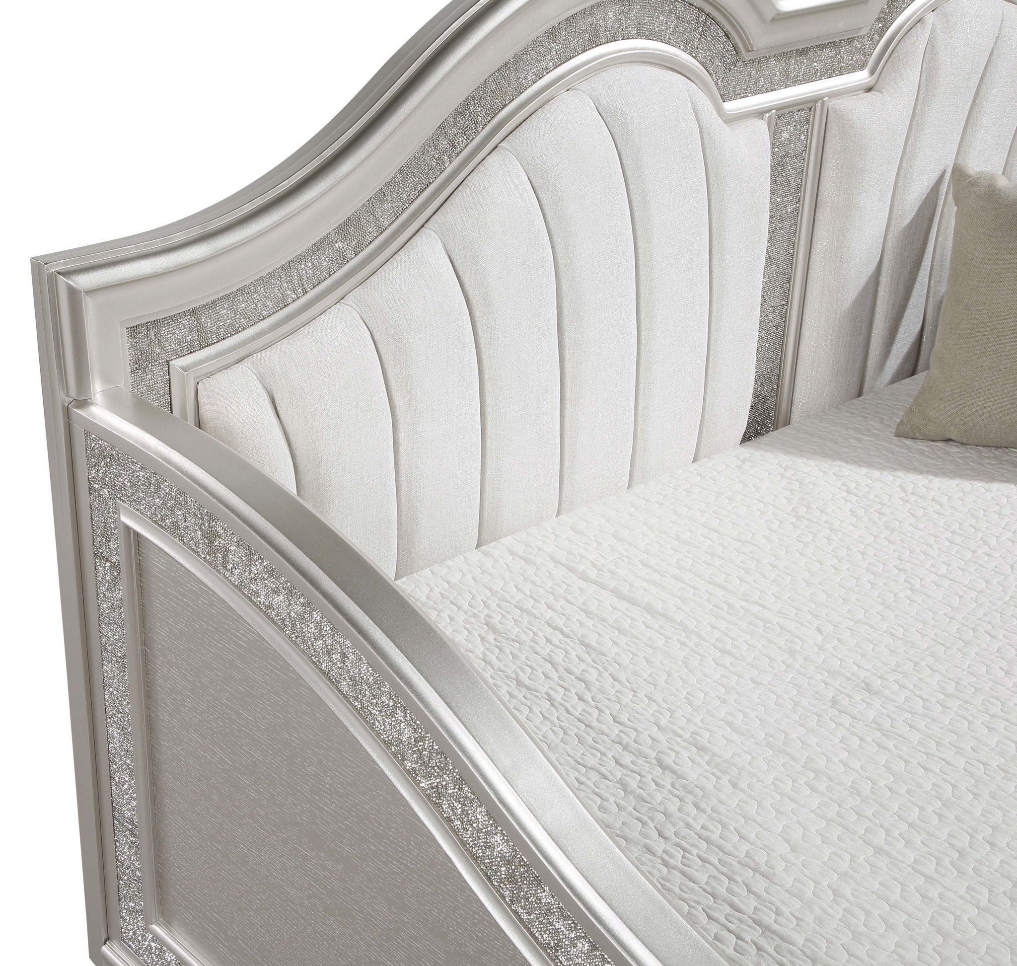 This luxurious daybed from the Evangeline collection is perfect for accommodating overnight guests or creating functional small spaces. Its eye-catching and versatile design, with a curved silhouette and faux diamond trim, adds a touch of elegance to any room. Key Features: • Twin daybed with curved back and sides upholstered in soft ivory chenille fabric • Silver oak wood finish and oak veneer add refined glamour to the frame • Vertical channel tufting enhances plush panels for a tailored, elegant look • Faux diamond trim highlights headboard framing with subtle shimmer • Slatted base supports mattress directly with no foundation required • Crafted from poplar, engineered wood, polyresin, and foam for lasting support