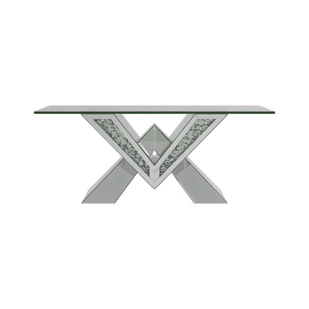 This mirrored coffee table serves as a stunning centerpiece with its bold design. The V-shaped base showcases mirrored panels and sparkling crystal accents for an opulent look. The rectangular, beveled tempered glass top adds elegance and practicality, making this table ideal for entertaining or displaying decor. A striking blend of luxury and modern aesthetics, it elevates any living space.
