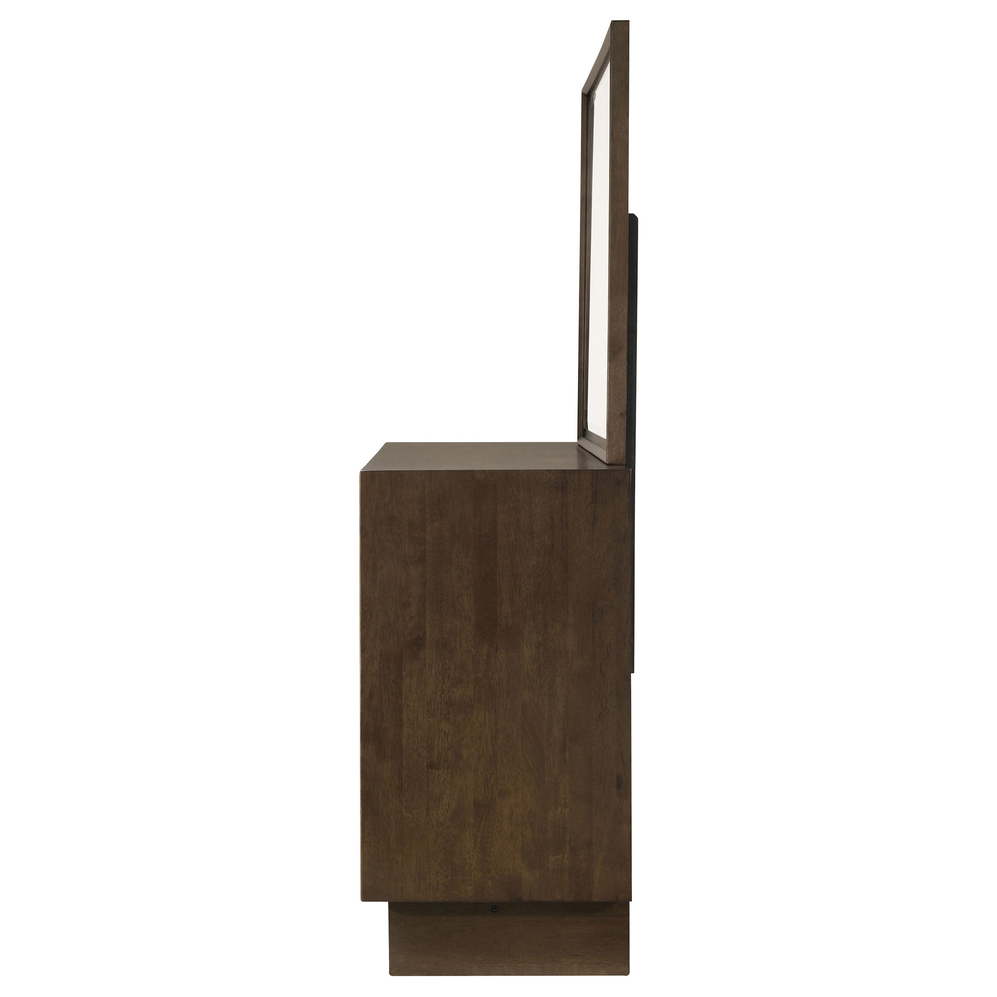 A modern six-drawer dresser includes a framed mirror for a complete look and feel in your bedroom. The dresser offers ample storage with roomy drawers, the top two of which include dark brown felt lining for added protection for delicate items. The wooden design features a warm brown wood grain finish, perfect for streamlined simplicity in your bedroom. Drawer fronts are surrounded with mitered trim and fingertip pulls for a smooth, refined presentation. The dresser is topped with a framed mirror that includes matching mitered trim and beveled glass for easy reflectivity. Key Features: • Clean, straightforward design details bring stylish flair to a modern six-drawer dresser and mirror • A warm brown wood finish complements rubberwood veneer and wood construction for a handsome look • Fingertip pulls create a smooth, flat drawer front design, adding to a streamlined look and feel • Top drawers include felt lining in a dark brown color, adding protection for delicate items • Drawers feature English dovetail joinery and metal glides for excellent performance