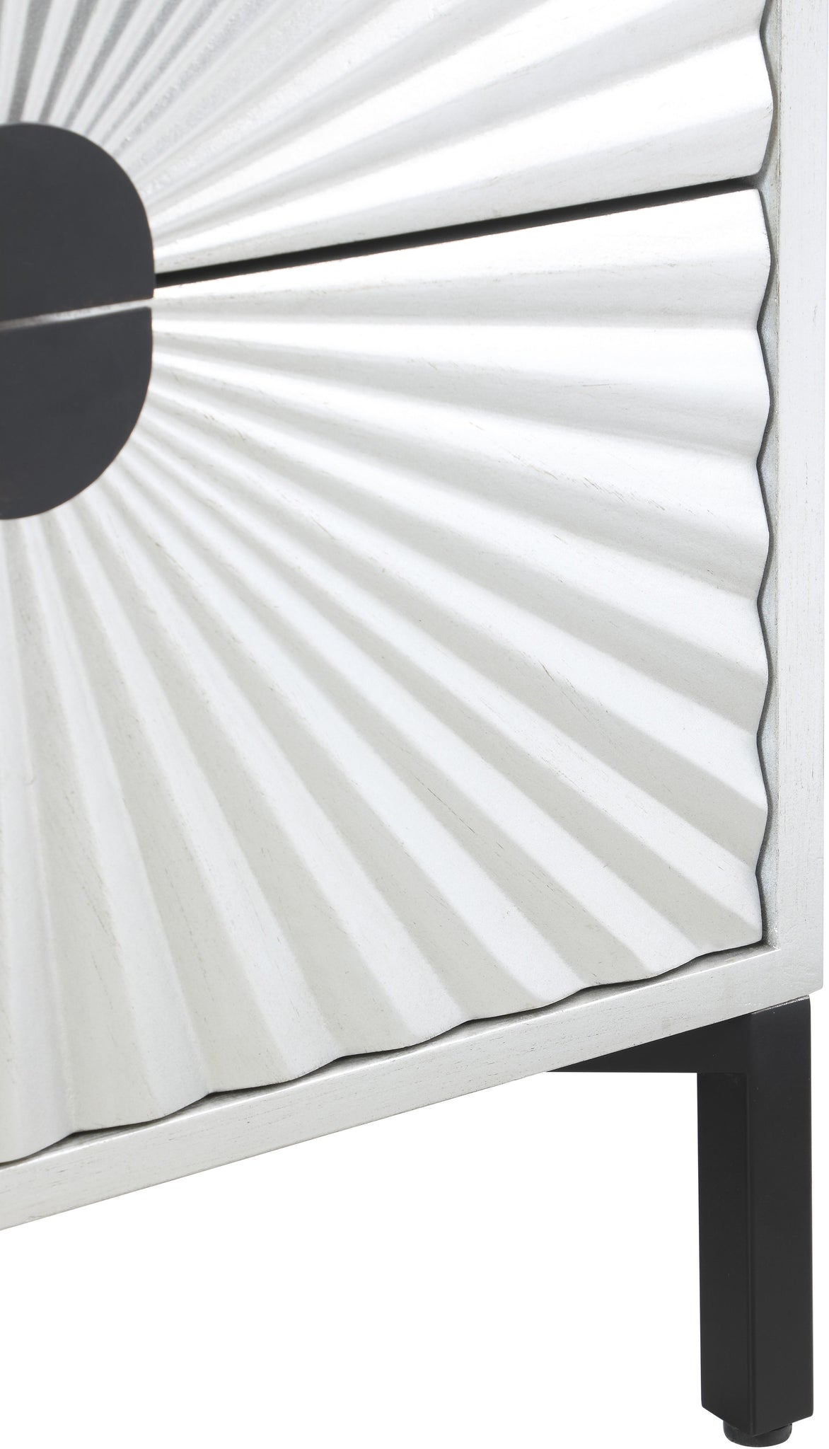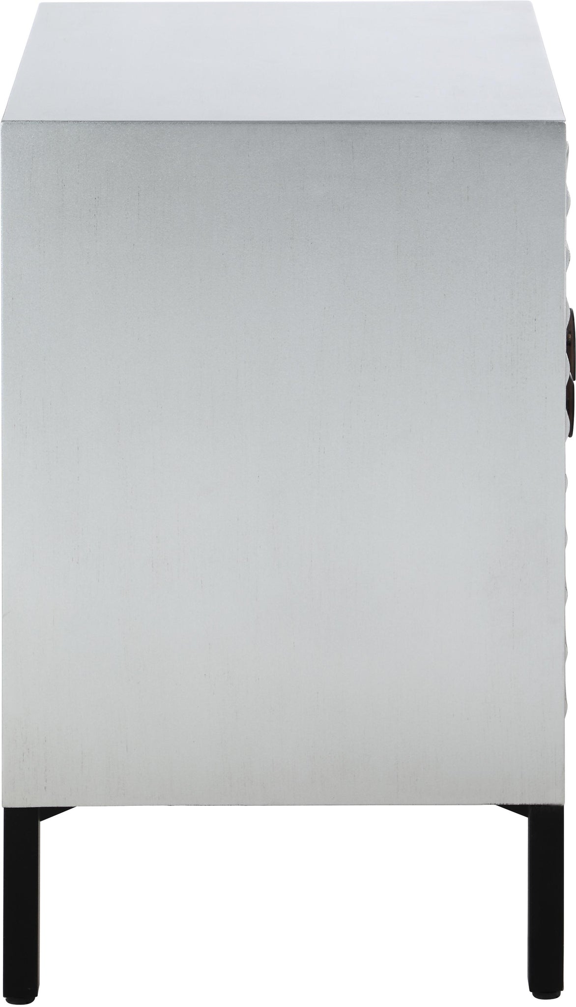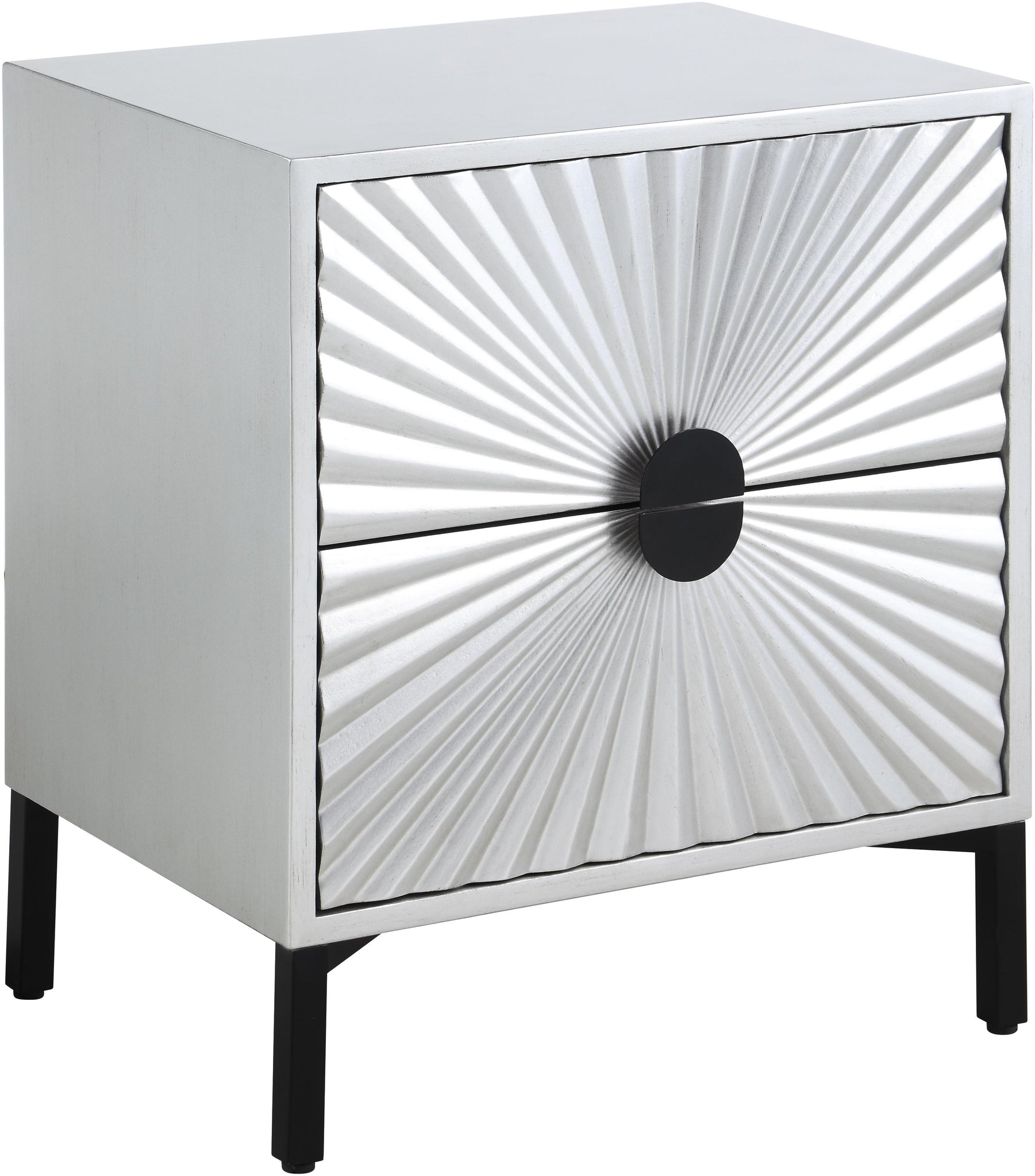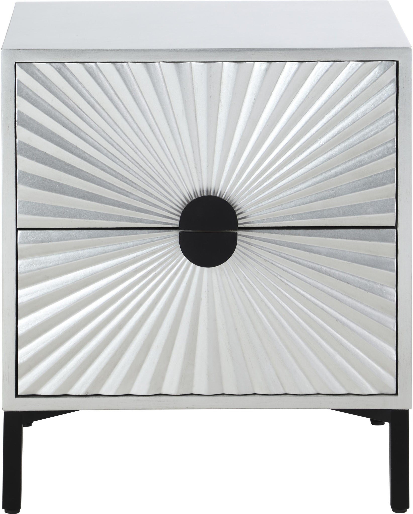 Bring on the glam with this pretty Glitz side table. This elegant table features a starburst design across the panels on its two drawers, making it an eye-catching element for your living room or bedroom space. The shared hardware on the drawers is matte black for a luxe look against the antique silver color palette. Add this attractive side table wherever creating a dramatic effect is the goal.