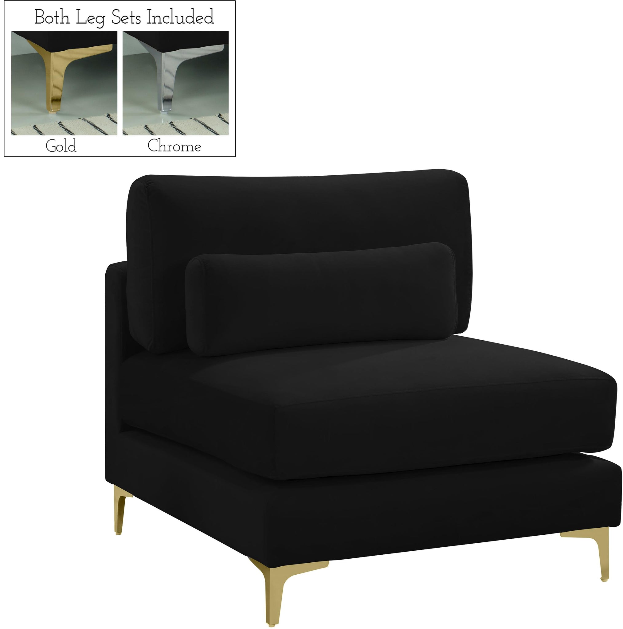Ready to get cozy? Curl up from the welcoming confines of this Julia velvet modular armless chair and you can do just that! Its soft black velvet upholstery is soft and supple to the skin, coaxing you to relax, unwind, and sit for a spell. It comes with both gold and chrome legs for a customizable and contemporary finish. Pair this Julia piece with others to form an infinite number of seating configurations to meet your particular decorative desires and space requirements.