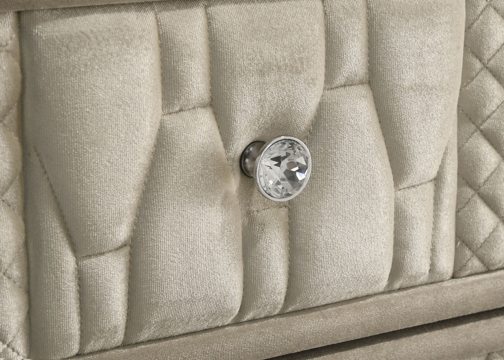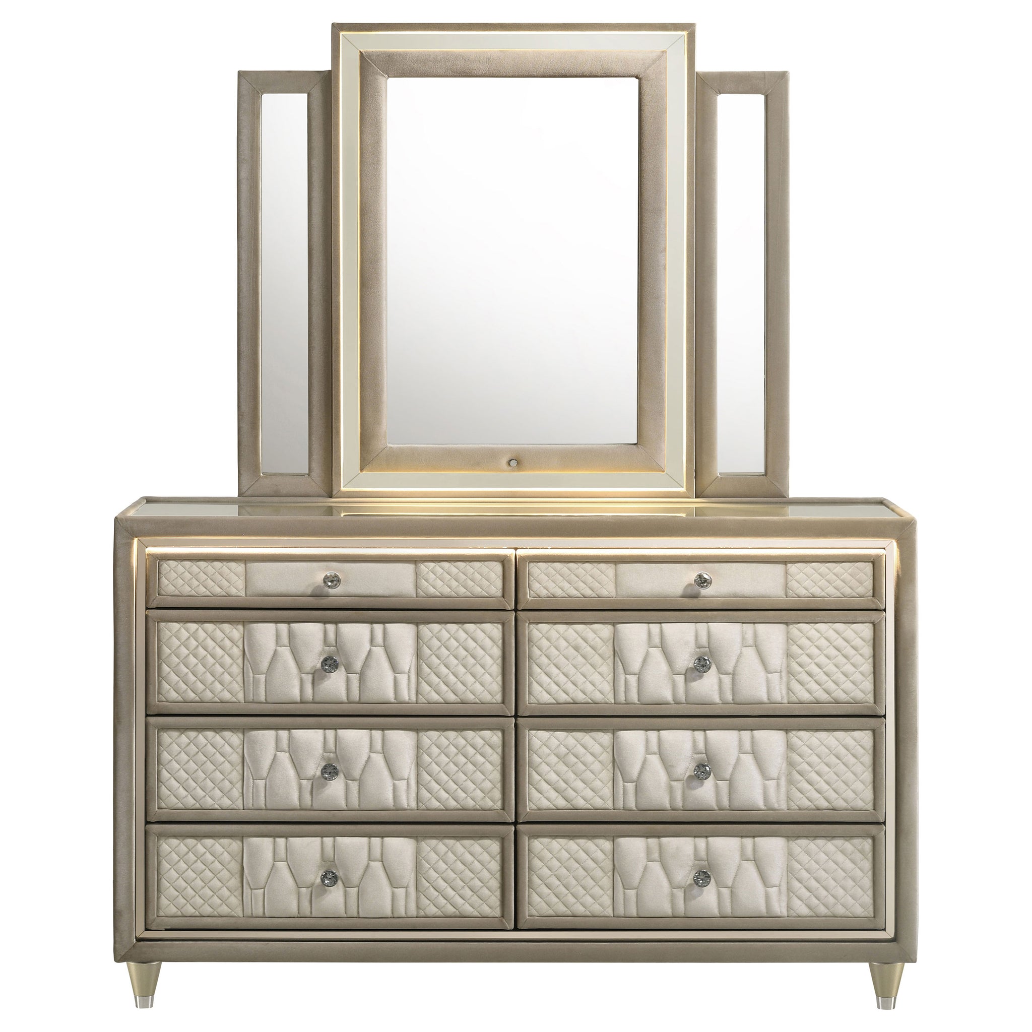 This dresser and mirror set blends soft velvet textures with luminous design for a refined bedroom statement. Fully wrapped in ivory and camel velvet, the eight-drawer dresser features a clear tempered glass top, LED trim, crystal knobs, and reflective acrylic touches. Above, the tri-panel mirror offers LED lighting and velvet framing. With felt-lined drawers, dovetail joints, and solid rubberwood legs, this set balances elegance with enduring practicality. Key Features: • Dresser and mirror set with LED-lit case frame and velvet wrap in ivory and camel • Eight drawers with quilted fronts, crystal knobs, and reflective acrylic detail • Tri-panel mirror with built-in LED lighting and soft-angled visibility • Tempered glass tops the dresser for added shine and durable surface protection • Felt-lined top drawers with English dovetail joints and heavy-duty glides • Crafted from solid and engineered wood and supported by solid rubberwood legs