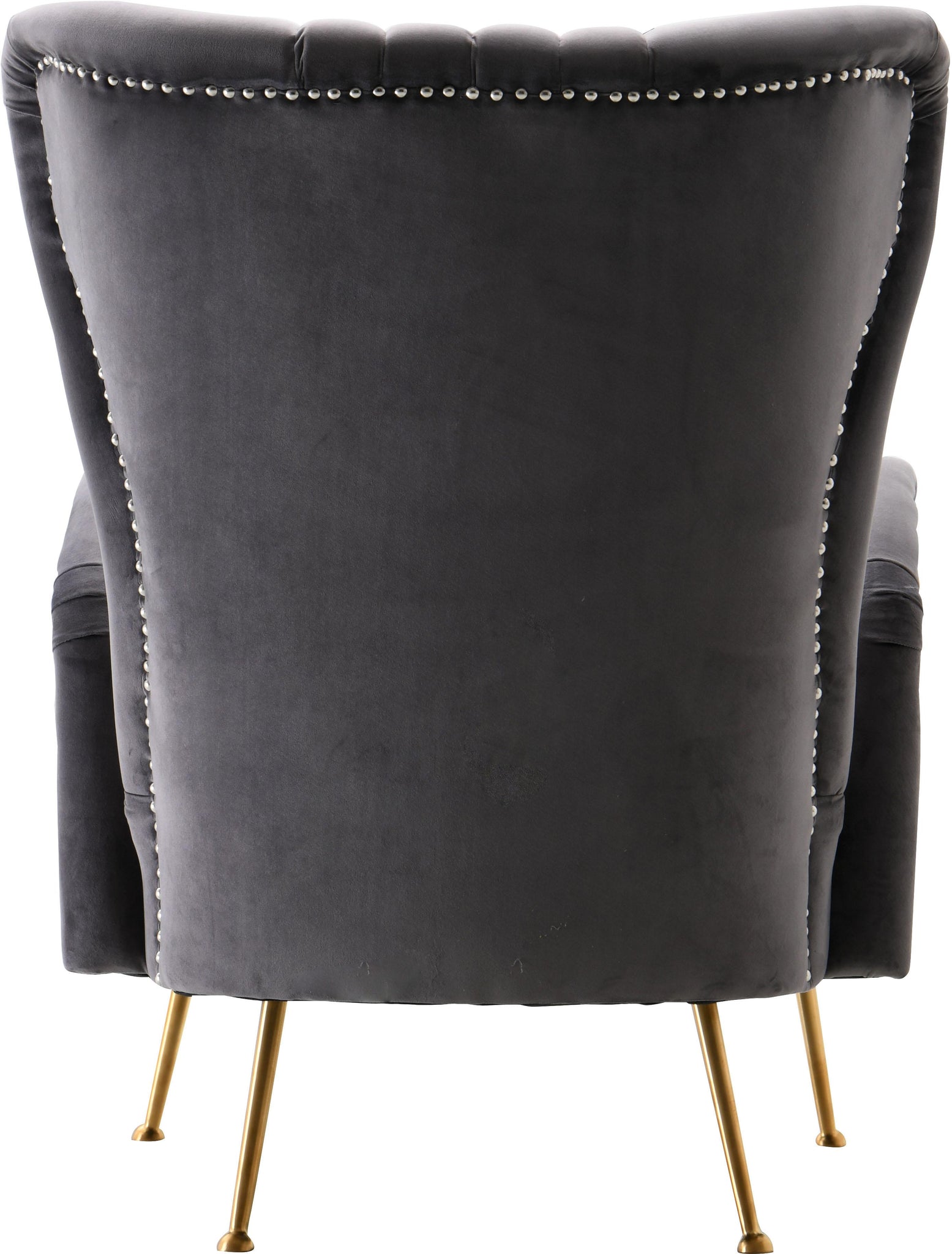 Inject contemporary finesse into your space with this pretty Opera grey velvet accent chair that puts a new twist on a classic design. This chair features a plush footprint with thickly padded back, seat, and arm cushions that cradle each part of your body, so you can relax and unwind at day's end. The legs are made from stainless steel for strength and durability and have a gold tone finish for a rich, elegant look. Horizontal tufting on the seat and back add to the distinctive look of this fabulous chair.
