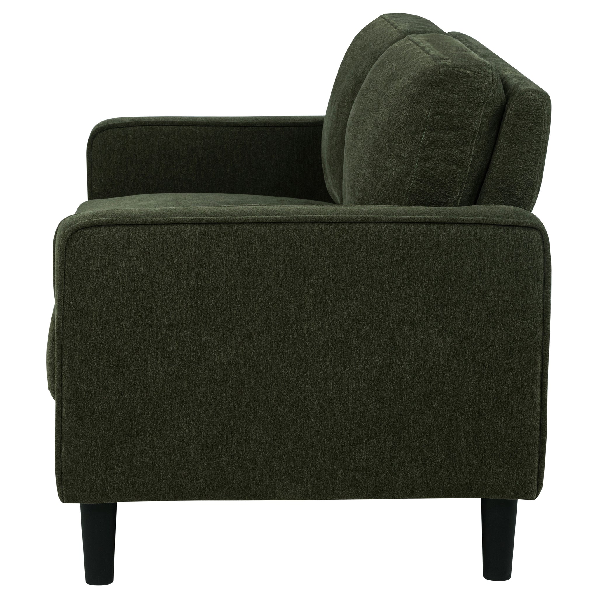A compact profile makes this modern loveseat the perfect choice to add seating in a living room or den. It’s a structured silhouette complete with track arms. Faux leather upholstery is supple and smooth, offering contemporary style and sophistication that impresses without overwhelming. Plush cushions provide wonderful comfort for lounging, with sinuous spring decking under seats and a webbed back. Tapered, straight legs offer a chic finishing touch, providing support and stability. Key Features: • Compact two-seater loveseat with a stylish, space-saving design • Black faux leather upholstery creates a sleek and polished appearance • Foam-filled cushions deliver optimal comfort and firm support • Slim track arms enhance the modern and minimalist silhouette • Tapered wooden legs offer strong stability and mid-century charm • Sturdy frame construction ensures durability for daily use