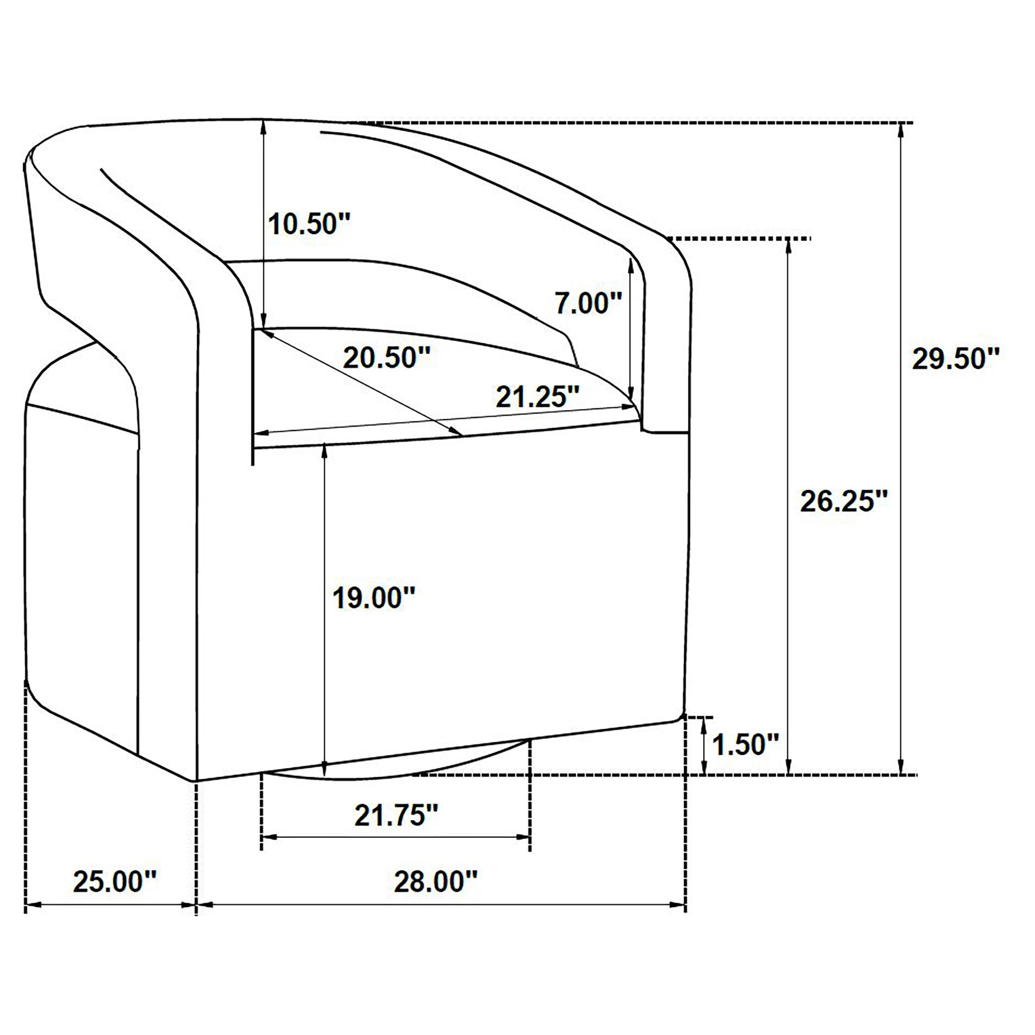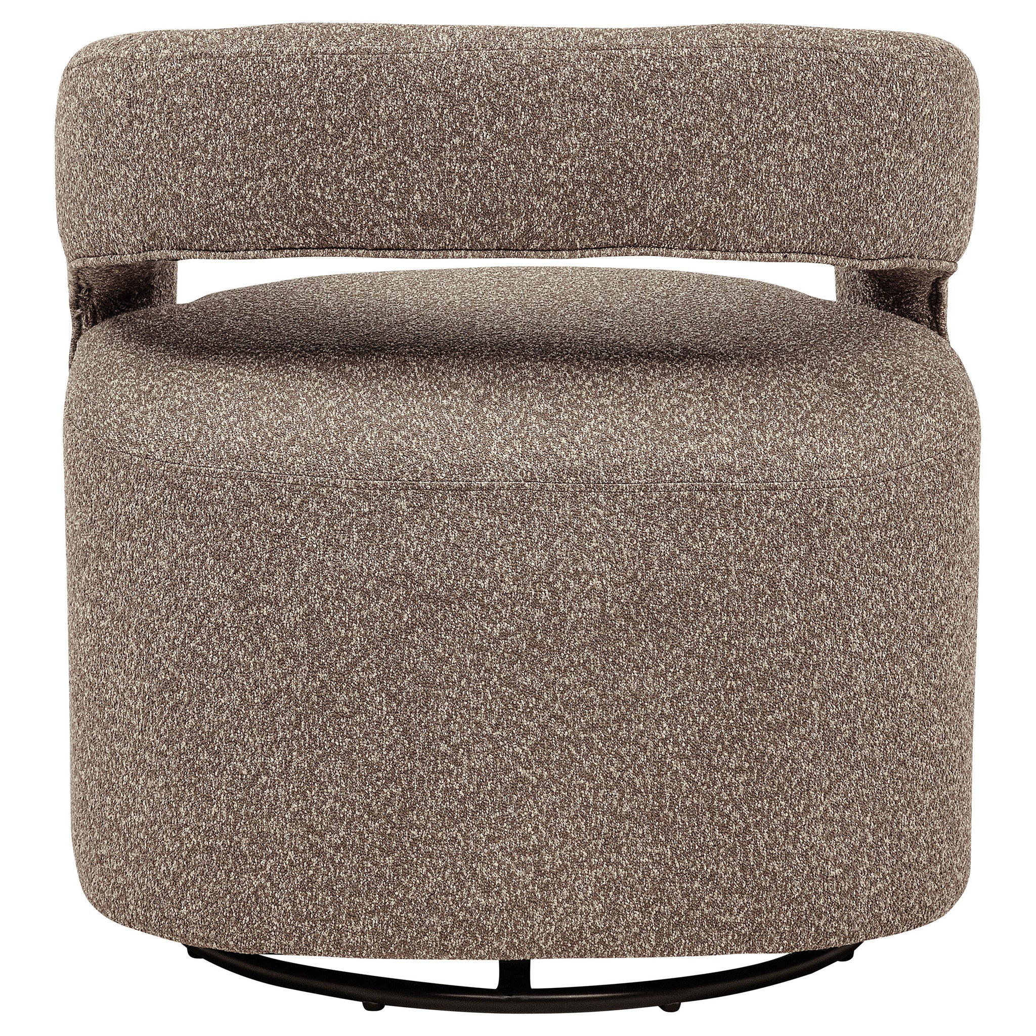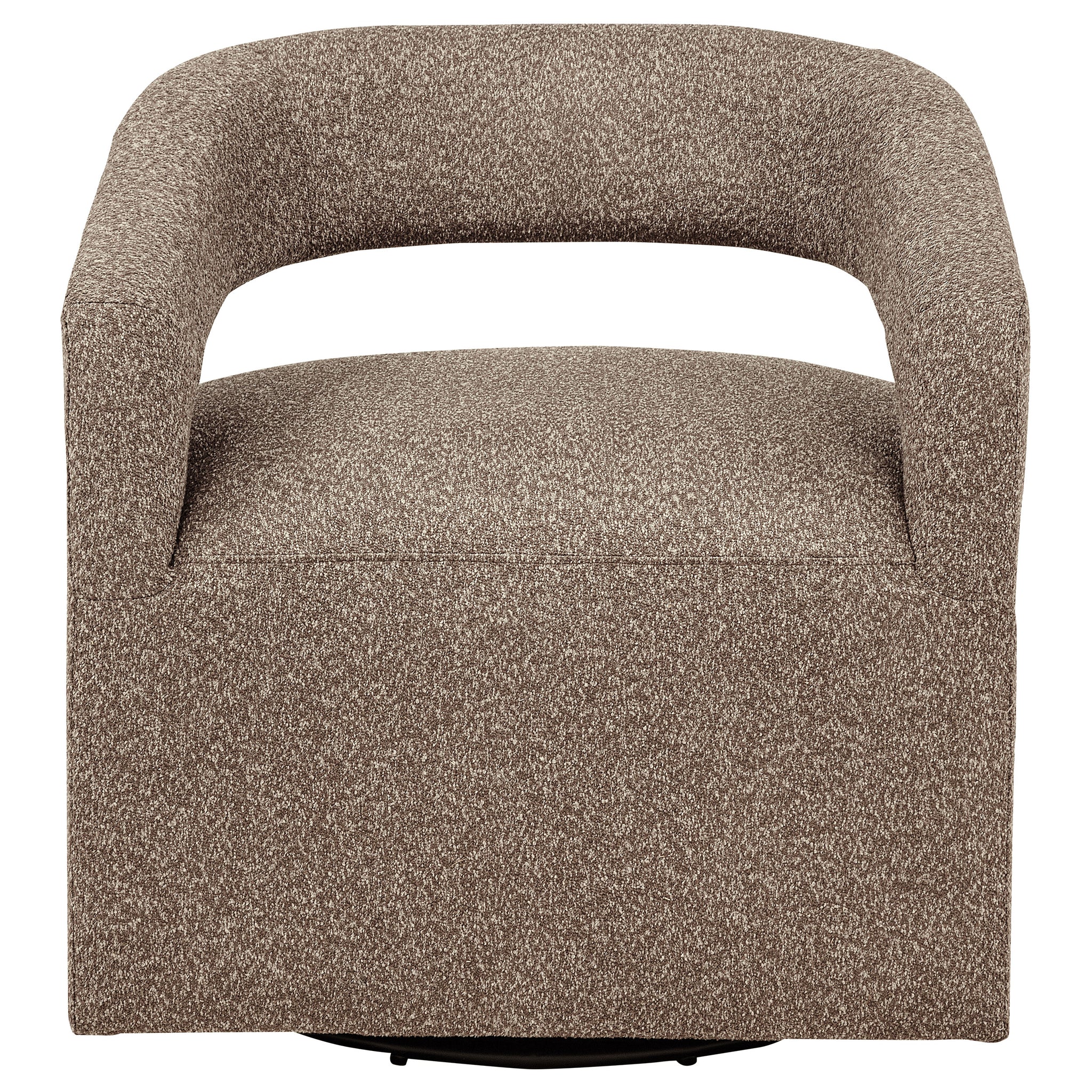 Curved form meets effortless movement in this modern swivel accent chair. With a rounded open back and tailored seat, it delivers sculptural balance and all-around comfort. Upholstered in textured boucle and built on a hidden swivel base, it glides smoothly to support dynamic living. Its compact footprint and graceful silhouette make it ideal for layering into lounge corners, reading nooks, or open floor plans seeking softness and versatility. Key Features: • Swivel accent chair with round silhouette and open barrel back for modern function • Brown boucle upholstery creates a cozy tactile surface with a neutral visual tone • Concealed swivel base rotates smoothly for adaptive lounge or conversation use • Low-profile wraparound arms bring sculptural softness to the structured form • Foam-padded seat offers support and comfort for compact reading or lounge zones • Crafted from boucle fabric, foam cushioning, metal swivel base, and plywood frame