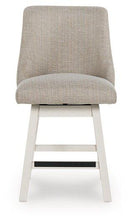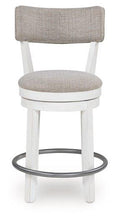 Modern farmhouse styling. Made with Rubberwood solids, Ash veneer and MDF substrates. Antiqued white finish with wonderful grain textures contrasts beautifully with the light gray upholstered seats and nail-head trim accents. D642-32 counter height table features a planked effect on the top with two 12" leaves that extend the table to 86" overall. D642-124 counter height barstool has classic farmhouse X-back with contrasting light gray cover with nail-head trim. D642-09 counter height bench for alternative seating options. D642-13T/B counter height island table is loaded with storage features including 10 bottle wine storage shelves [one is reversible], lower door cabinet accessible from both sides, and 2 large capacity pass-through drawer bins. D642-60 server features plank-effect cabinet doors and top, antiqued white finish and satin nickel color hardware. Includes 4 cabinets, lower cabinets have one adjustable shelf each, two drawers. D642-45 dining table features a planked effect on the top with two 12" leaves that extend the table to 86" overall. D642-01 has classic farmhouse X-back with contrasting light gray cover and nail-head trim.