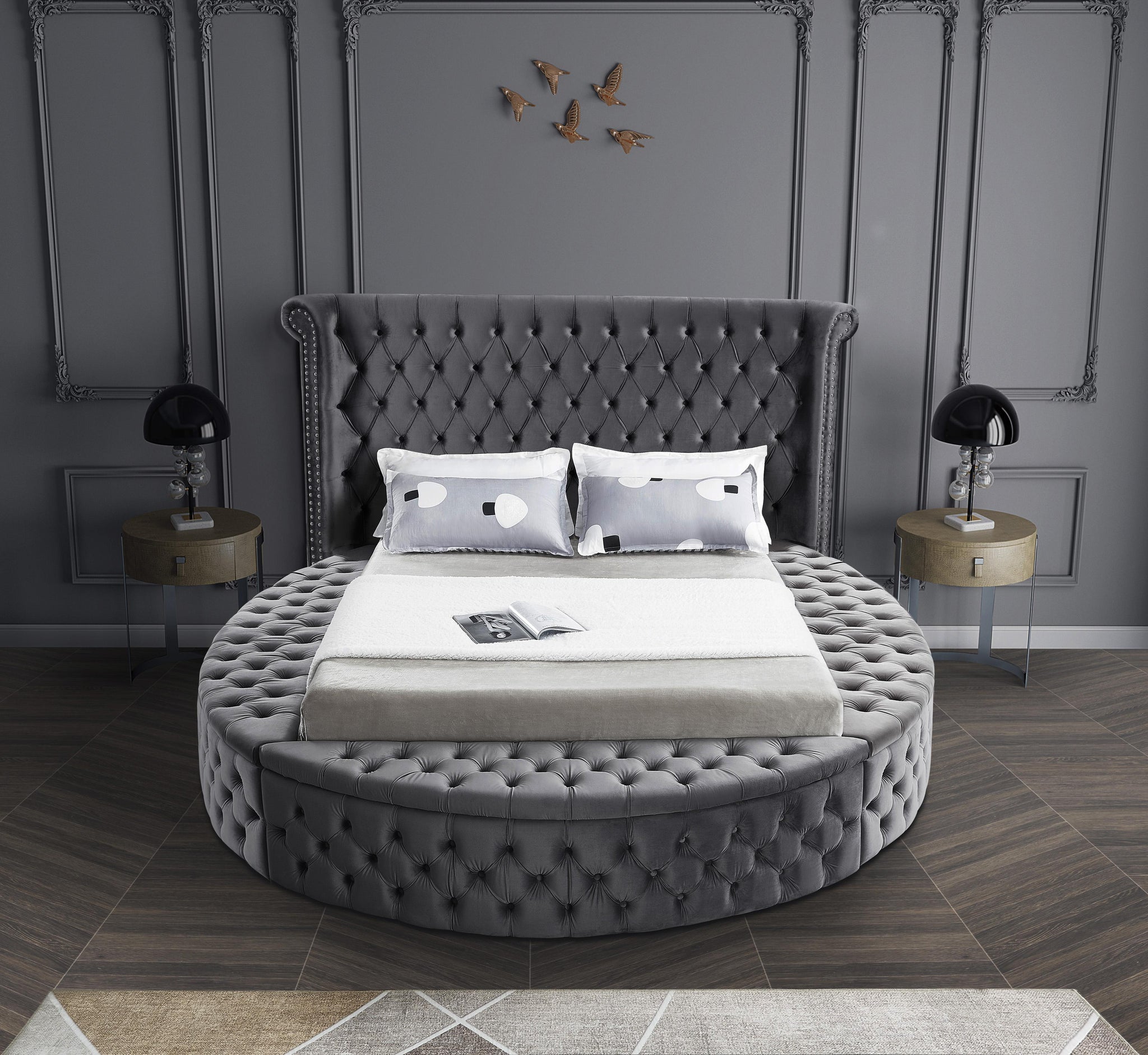 Marvel at the remarkable beauty and graceful lines of this round Luxus grey velvet full size bed. The headboard, footboard and side rails are all adorned with deep button tufting, and there is nailhead trim on both sides of the tall headboard. The footboard and side rails all contain ample storage and seating, making it easy to sit down in comfort so you can put on your pants or shoes.