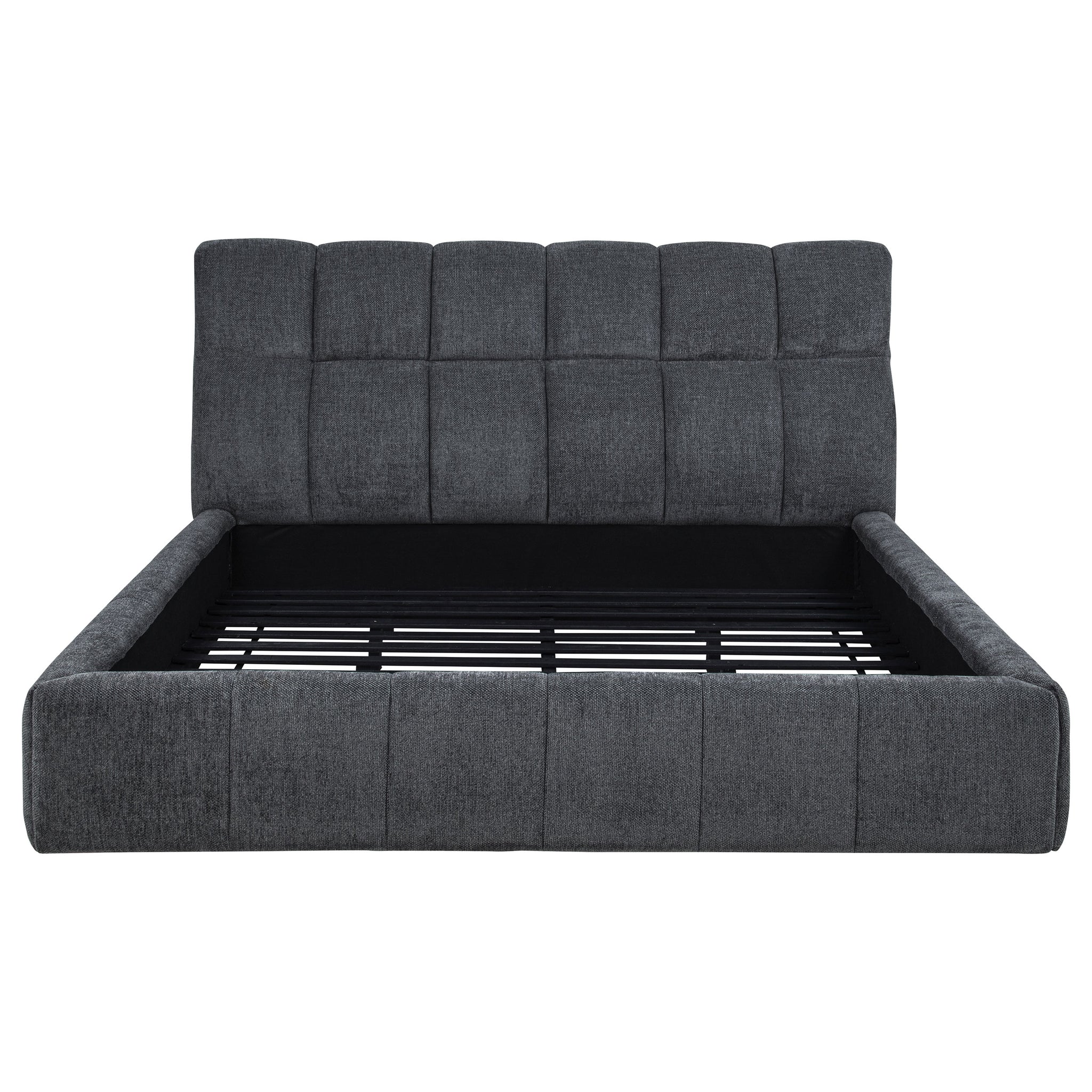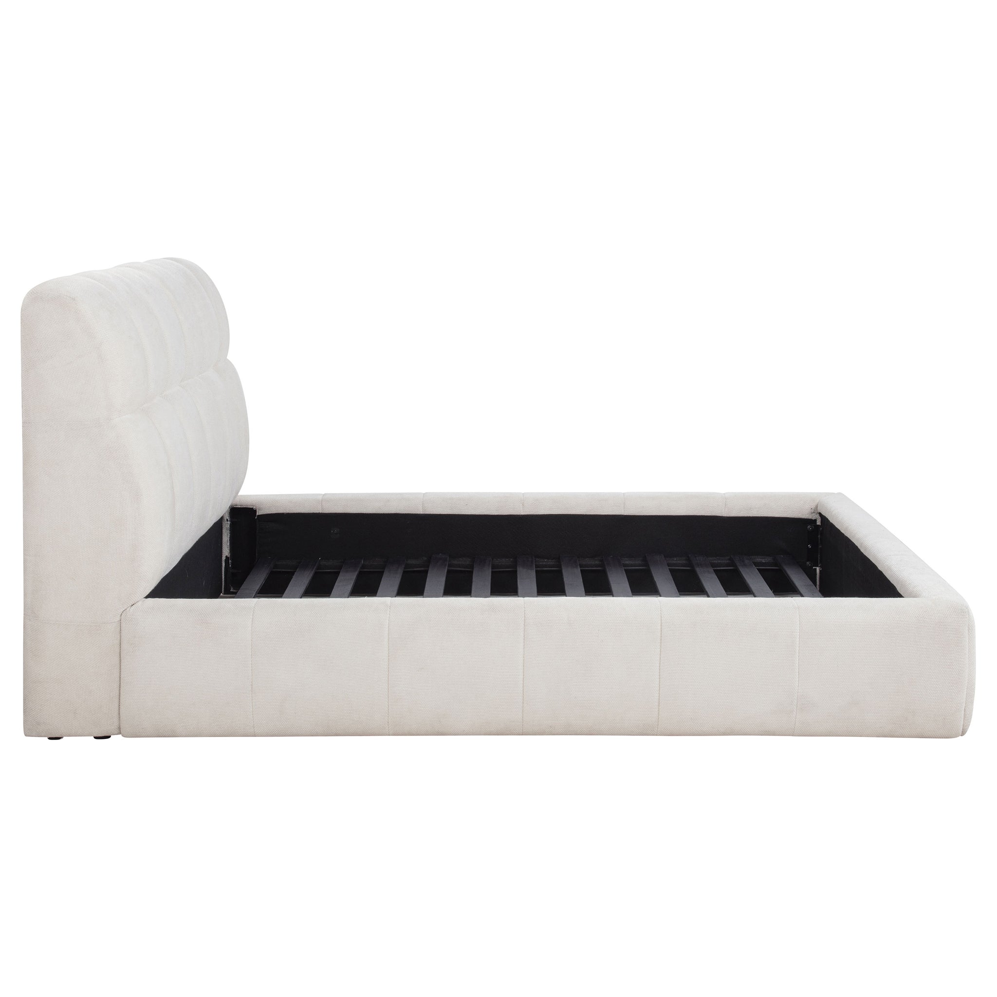 Tailored with bold lines and soft texture, this upholstered platform bed blends comfort with quiet strength. Vertical channel tufting runs along the headboard and foot rails, adding dimension and rhythm to the silhouette. Wrapped in plush fabric and fully slatted for support, it eliminates the need for a foundation. Crafted from solid and engineered wood, this bed invites modern serenity into any bedroom retreat. Key Features: • Queen platform bed with vertical tufting for subtle texture and visual rhythm • Cream fabric upholstery adds soft elegance with a light, airy modern palette • Slatted platform design supports mattress without needing a foundation • High headboard offers sculptural depth and a softly framed silhouette • Crafted from solid pine, engineered wood, and foam for strength and support • Perfect for minimalist or contemporary rooms with light, calming tones