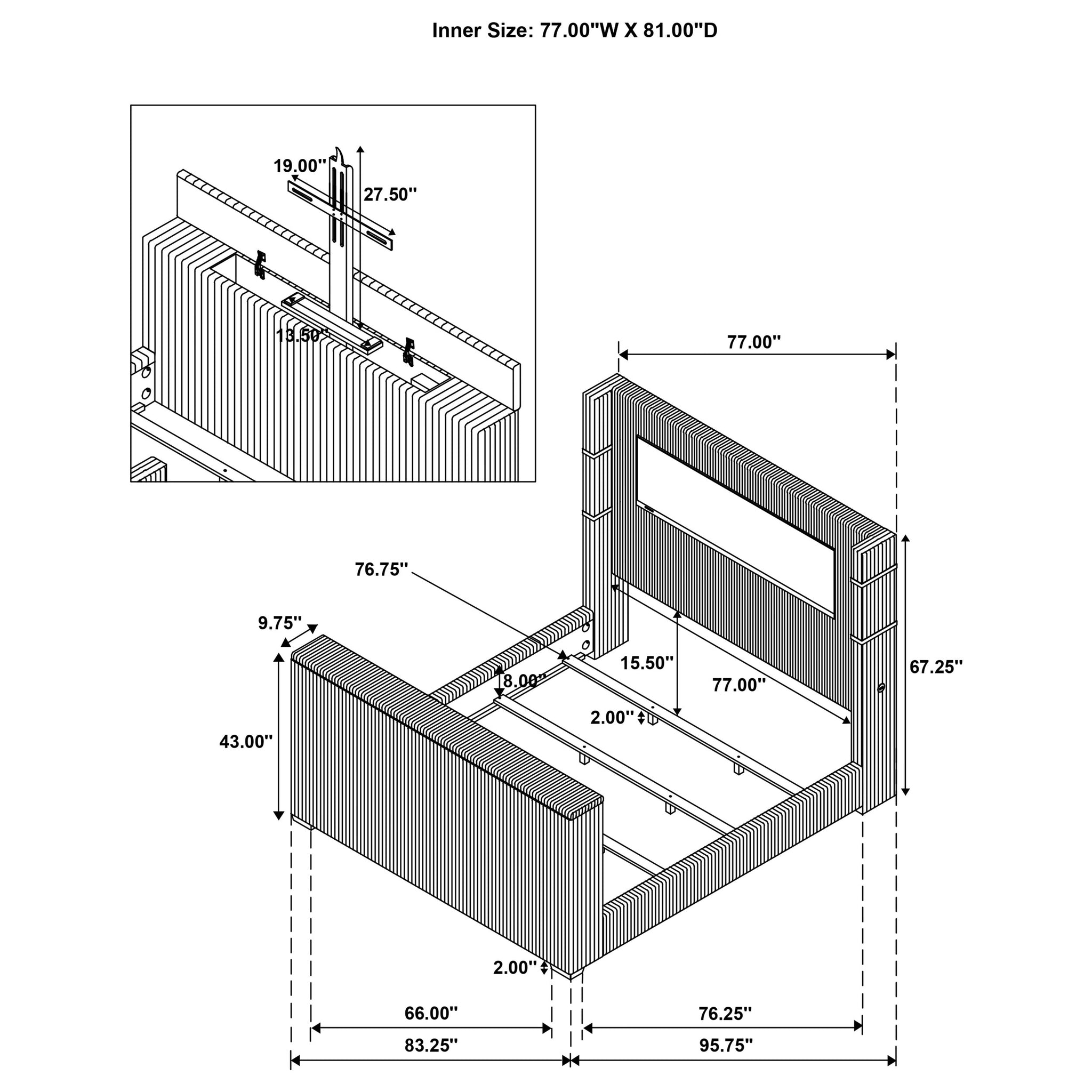 This innovative wingback bed levels up a top-selling design with bold tech upgrades and plush texture. A hidden motorized TV mount rises from the footboard via remote control, supporting screens up to 50 inches and tucking neatly away when not in use. The headboard’s flame visualizer glows over shimmering crystal rocks with sixteen color settings. Dual USB-A and USB-C ports on each side keep devices powered. Upholstered in soft, faux fur-style corduroy over a solid pine frame. Key Features: • Queen wingback bed upgraded with motorized TV lift in footboard and remote-controlled flame box • Plush black faux fur-like corduroy fabric delivers striking, tactile softness and bold style • Hidden footboard TV rack accommodates up to fifty-inch flat screens with smooth lift • Headboard includes crystal flame visualizer with sixteen color options and no heat output • Dual USB-A and USB-C ports on each side of headboard provide fast, convenient charging • Solid pine frame and seven-foot electrical cord ensure reliable structure and easy power access
