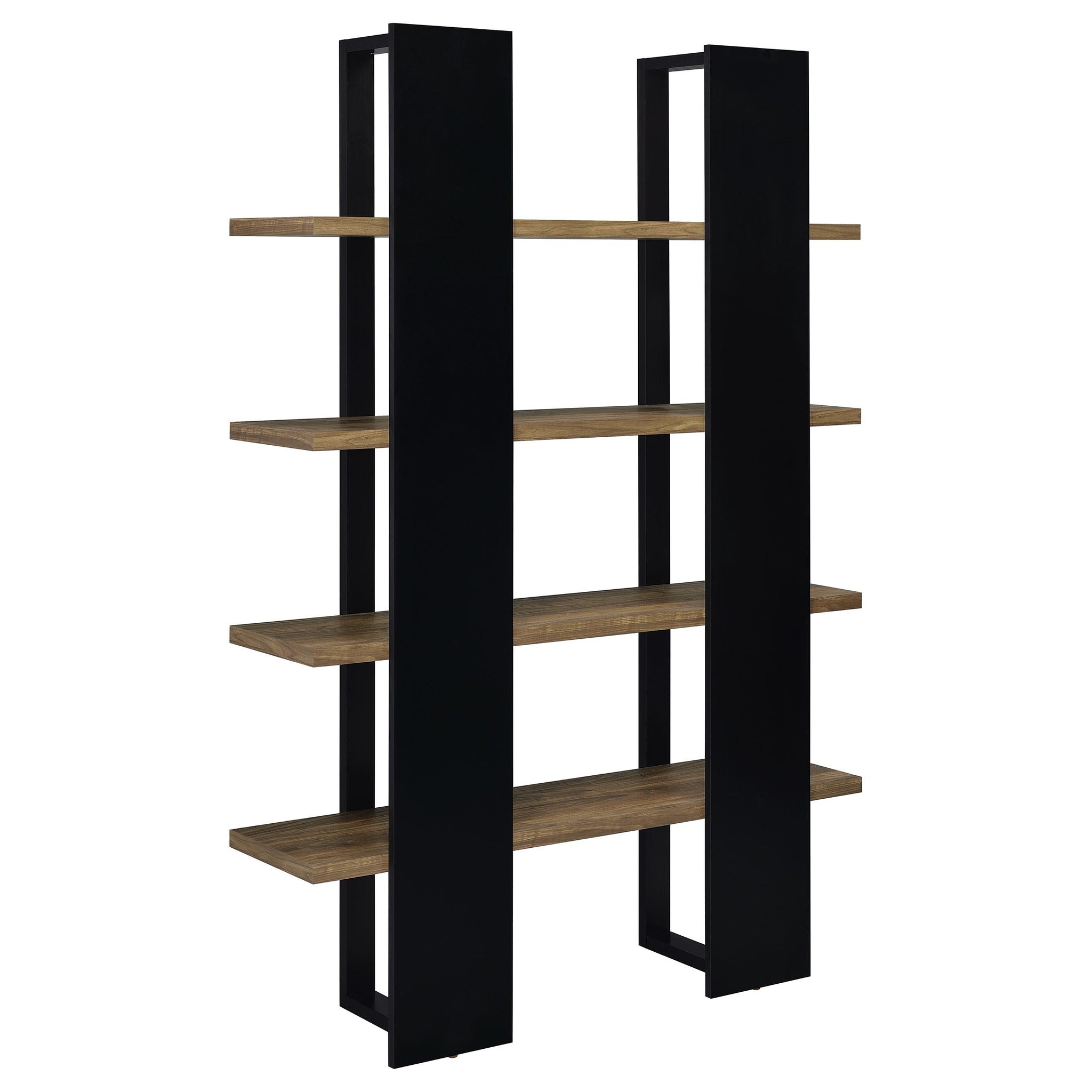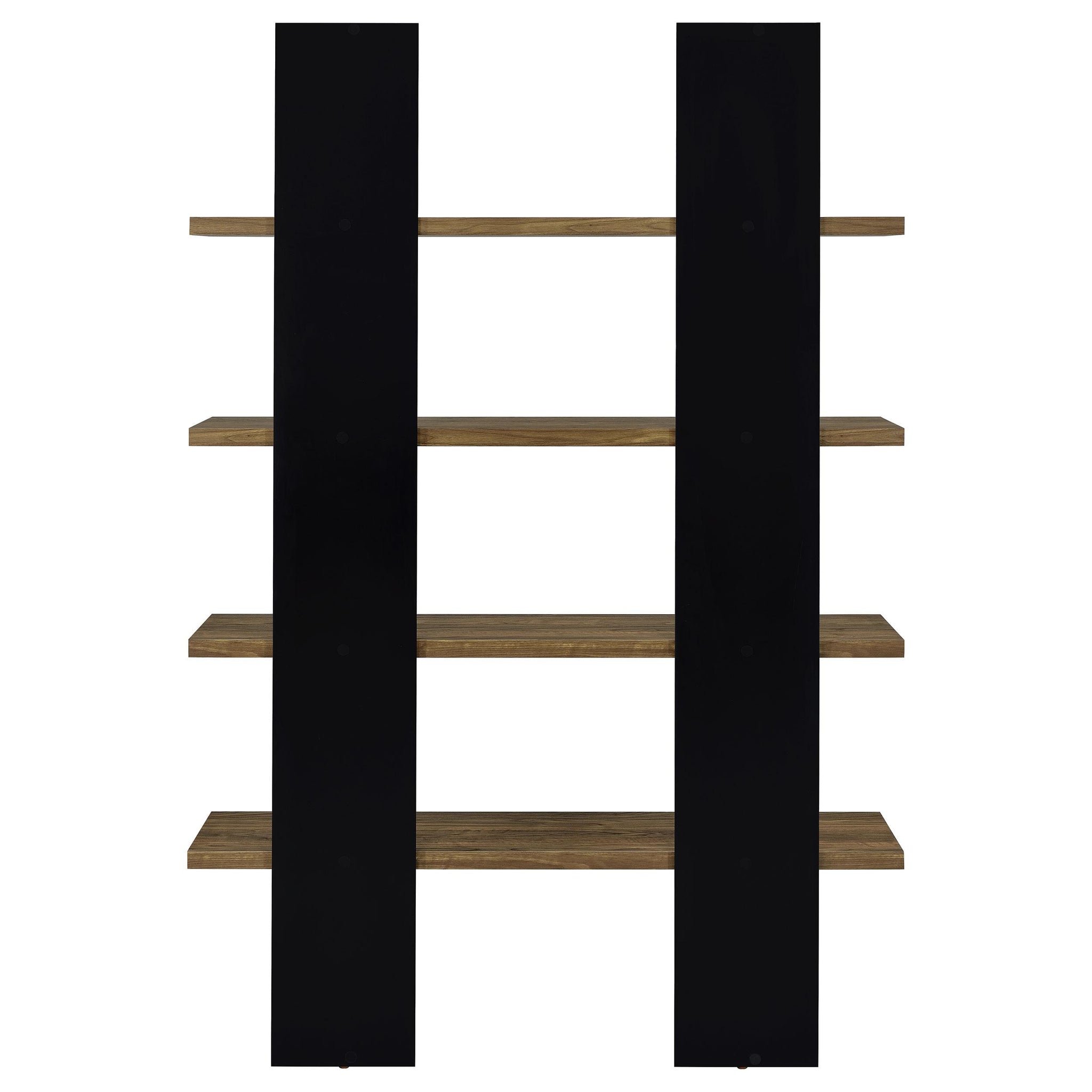Clean lines and a floating style elevate this contemporary bookcase into a truly stylish furniture piece. With an elegant two-tone finish, this bookcase features an open and airy shelving design with four spacious full-length shelves to display decor, family photos, and more. Each shelf appears to float above one another, enveloped and held in place by a sturdy bracket-inspired frame. Each shelf also extends past the frame, lending a streamlined effect. Available in three different two-tone color combinations, choose the bookcase finish that pairs best with your existing color palette and home decor. Key Features: • Breathe new life into your home or office with the vibrant contrast of this bookcase • Offered in three two-tone finish combinations, you’re sure to find one that calls to you • Features four full-length shelves that extend past the frame to decorate as you see fit • Constructed with MDF, particle board, and engineered laminate • Available in walnut/white, black/walnut, and driftwood/cement finish options