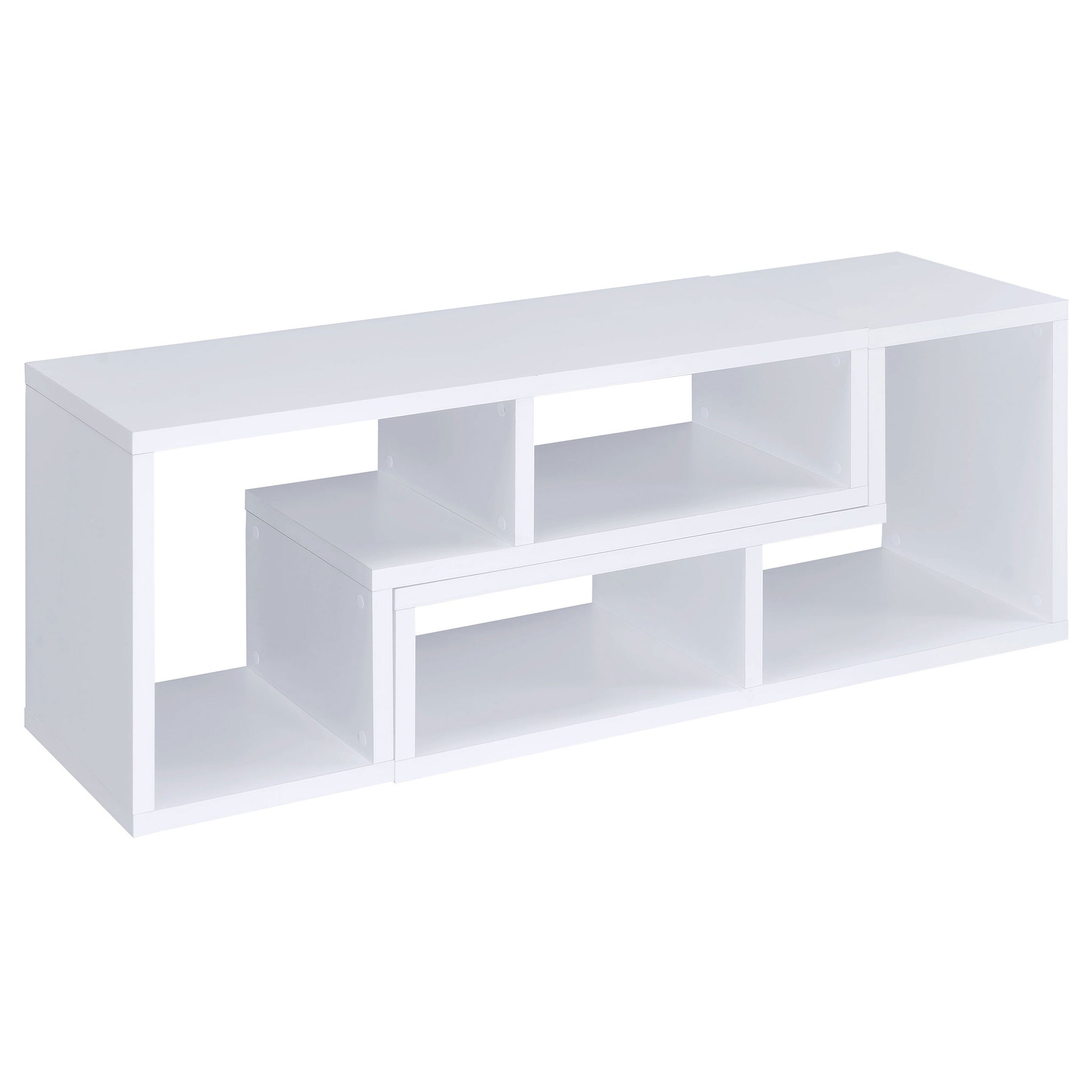 Perfect for a variety of uses, this two-piece bookcase and TV console is fabulously versatile. It allows you to switch between various bookcase and TV stand configurations for your convenience. Bold, L-shaped shelves are arranged in striking geometric designs for a modern look. A white finish enhances its contemporary appeal. Crafted from top quality materials, this bookcase is sturdy, stylish, and smart. Key Features: • An asymmetrical arrangement of shelves creates an intriguing silhouette while offering ample storage space • Two-piece bookcase with an attractive L-shape design • Constructed with MDF, particle board, and laminate • Versatile design allows you to switch between various bookcase and TV stand configuration • Available in cappuccino, white, and grey driftwood