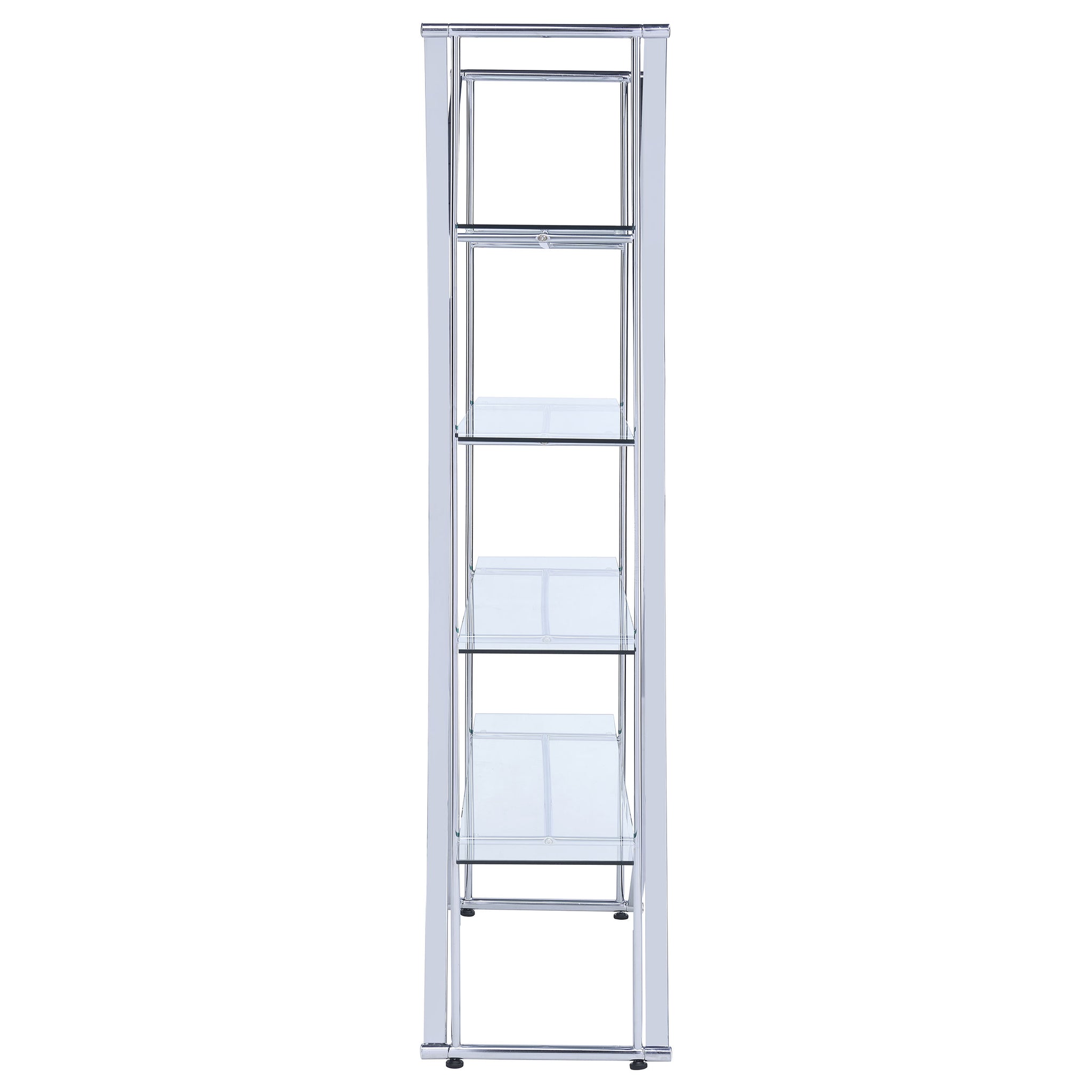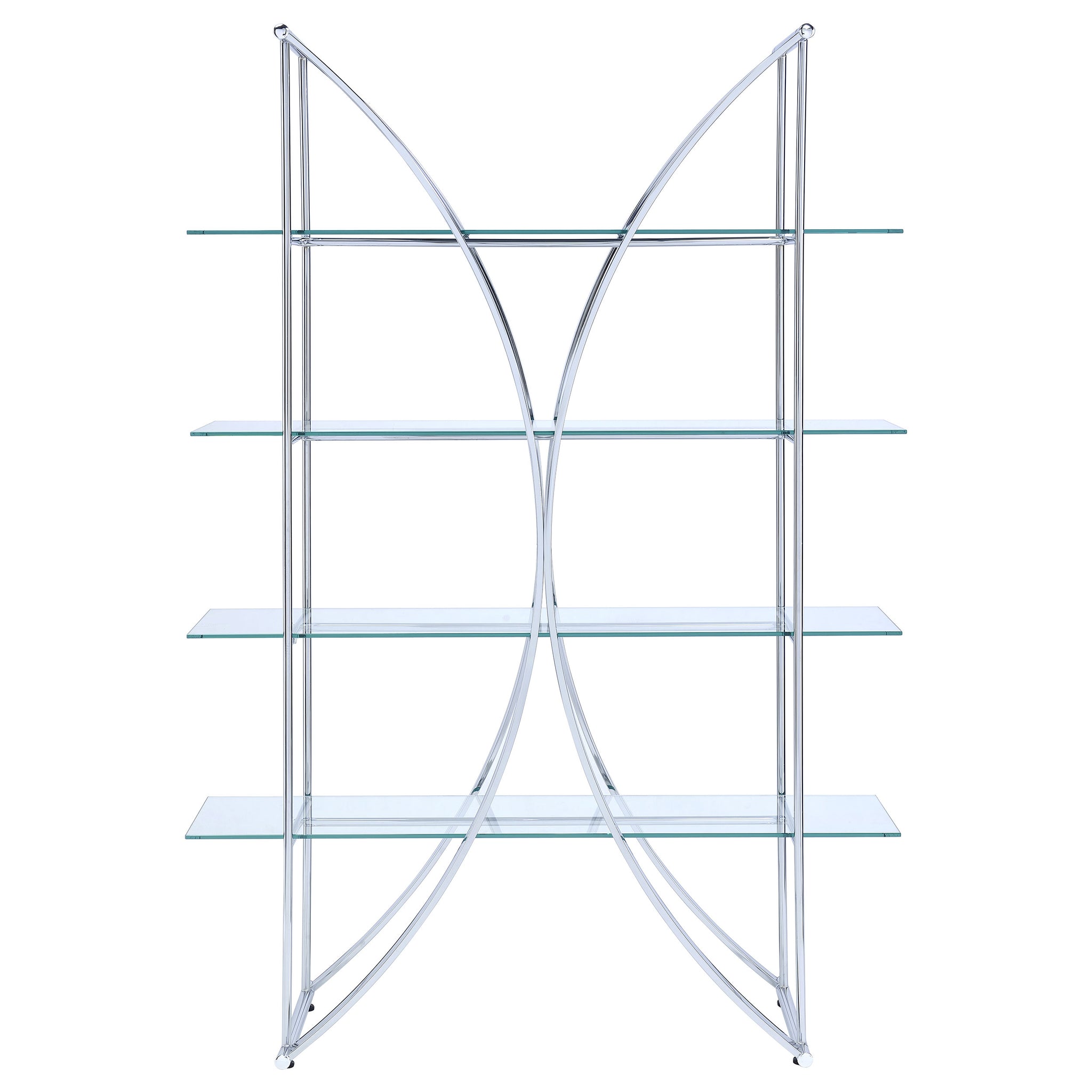 The ultimate in contemporary design rests in this eye-catching bookcase. Modern architecture meets art in a compelling silhouette blending arc-shaped and linear steel frames with clear tempered glass shelves. Four tiers offer ample space for displaying books, decor, and potted greenery. A fresh chrome finish adds luster to a tastefully designed contemporary space. Energize a modern room with a subtle yet tasteful bookcase. Key Features: • Sleek, graceful silhouette combines clean, straight lines with gentle curves • Bookcase features high quality electroplated chrome finish • Clear tempered glass shelves • Features four (4) versatile tiers of shelving • Metal and glass construction