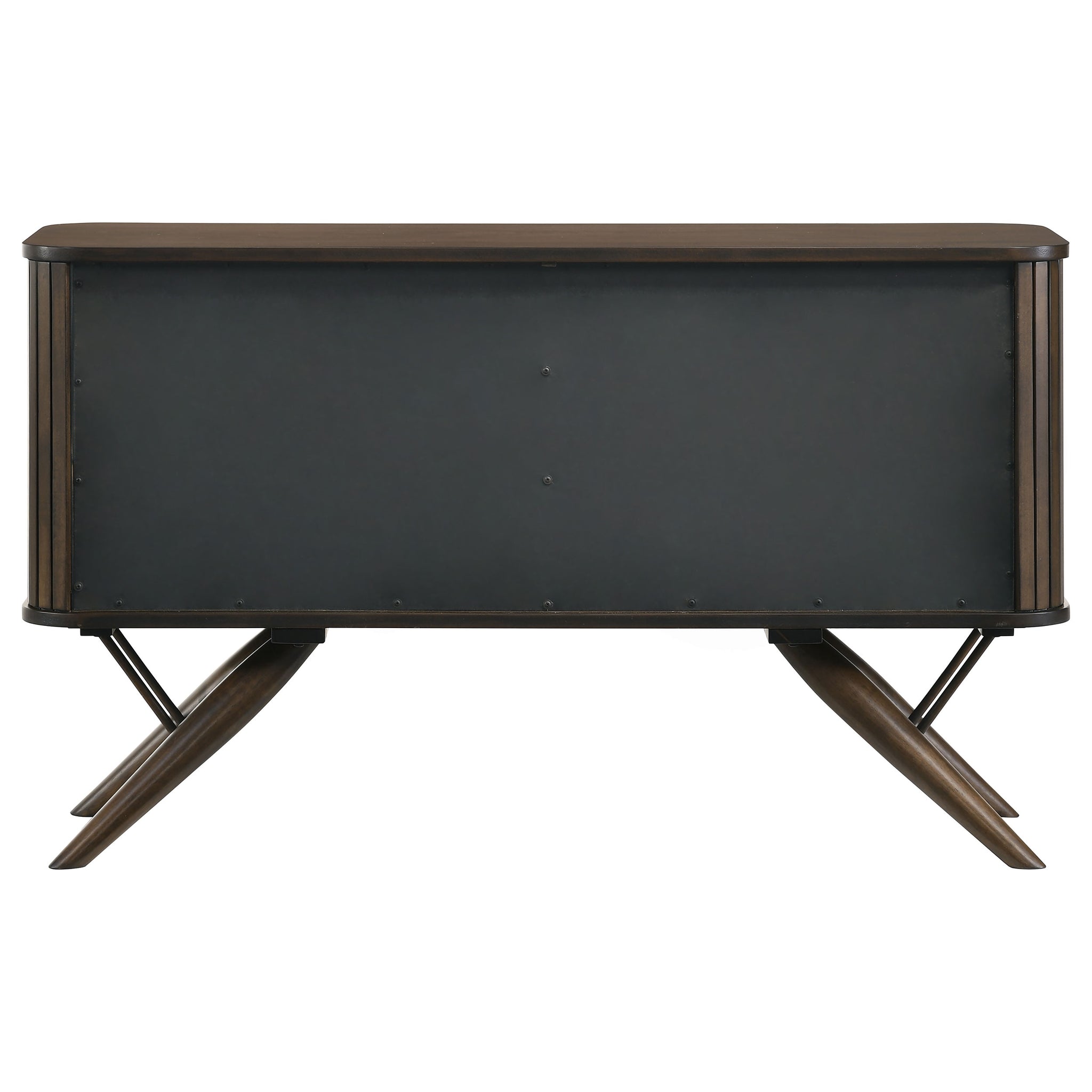 Elevate your dining area with this mid-century modern server. Beautifully designed with campaign style influences, this contemporary server rests on striking flared legs that offer a retro-inspired aesthetic. Tambour doors with finger-tip pulls bring out a nautical expression and a vintage touch. Open the cabinet doors and you will find ample space for all your dishes, stemware, and more. A rich, dark walnut finish brings out charming details. Key Features: • Casual dining can look elegant and still be functional for busy homes • Server with tambour doors offers plenty of storage • Fingertip pulls on each door lend a nautical aesthetic • Flared tapered legs bring a bold, mid-century modern vibe • Two removable shelves invite you to store and organize as you wish
