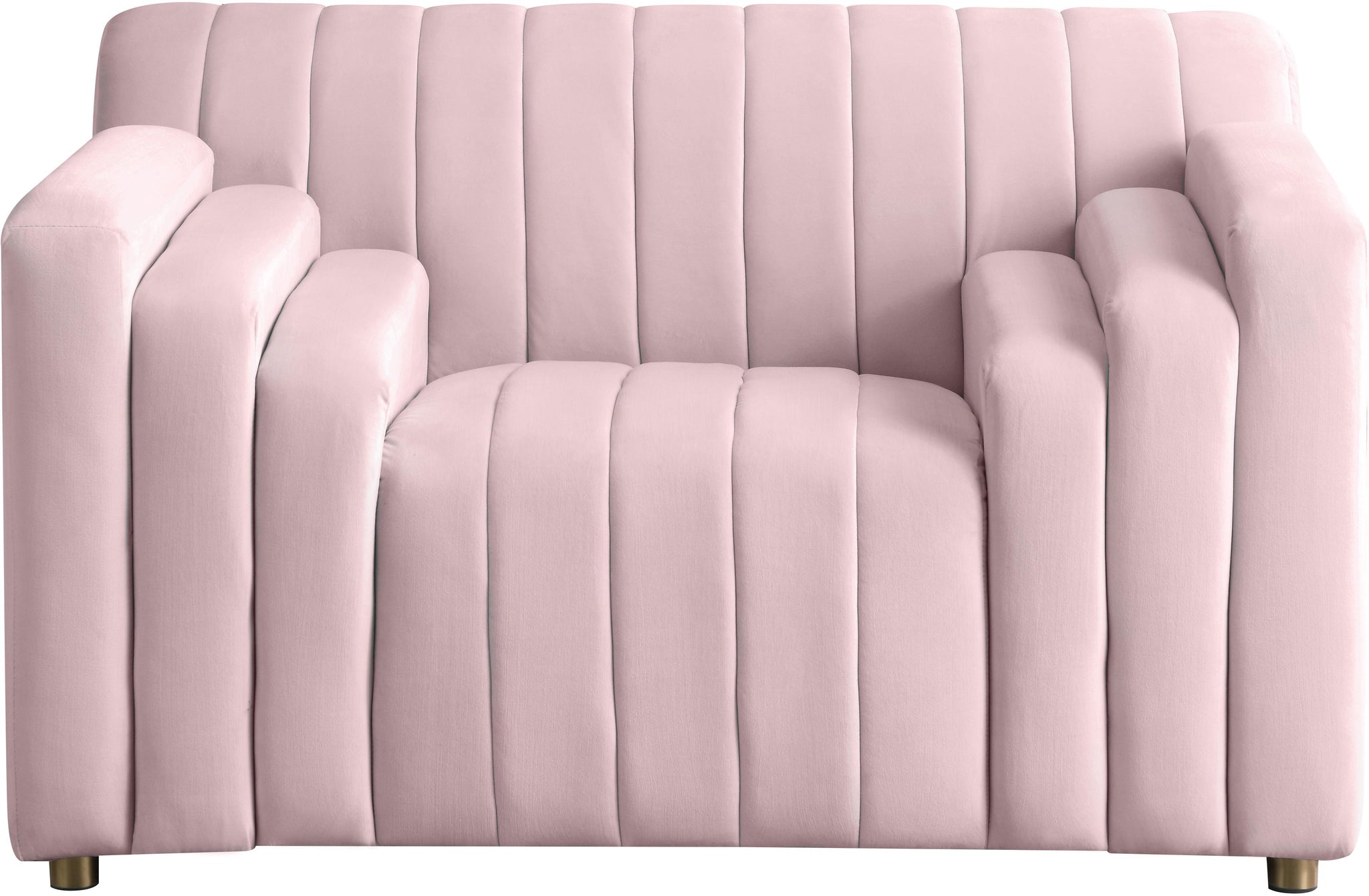 Express your bold, contemporary side with this Naya velvet chair. This handsome piece is upholstered in pink velvet and blends seamlessly with the other units in the Naya collection, or it looks equally as beautiful on its own. Deep channel tufts run the length of the back, arms and seats of this unit, ensuring its exceptional comfort while giving it a decidedly modern vibe.