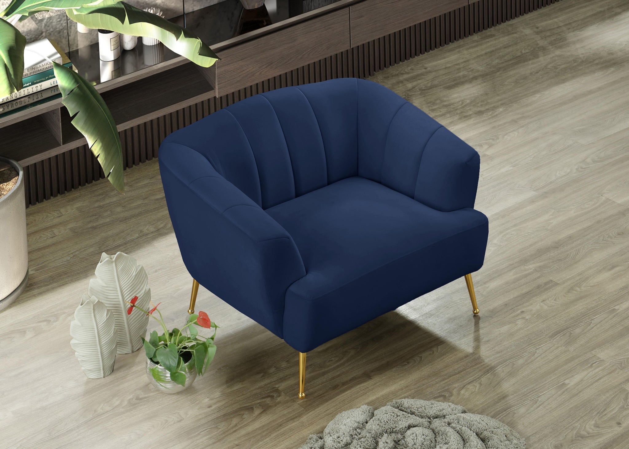 Dress up your living room space with this Tori Velvet Chair. This plush chair features sleek navy velvet upholstery that covers every square inch, adding a sumptuous and svelte look to your room. The gold legs with a ball design on the foot adds to the elegant look of this pretty chair, and deep channel tufting adds loft to the back and arms for a lavish feel when you sit down to relax and unwind at day���s end.