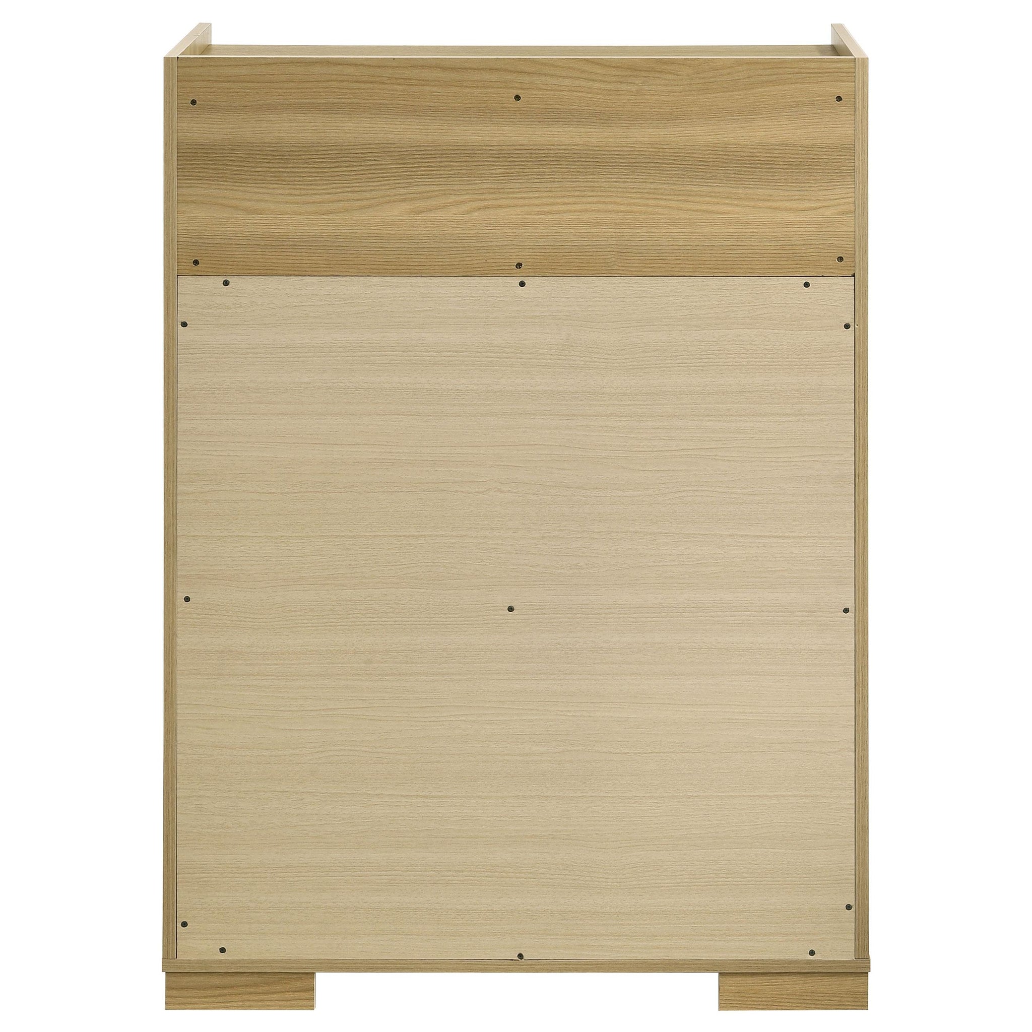 Add a touch of modern elegance to your bedroom with this stylish four-drawer chest. Inspired by contemporary Italian design, this chest features a sleek blend of natural wood tones and crisp white panels crafted from durable, easy-care melamine. The drawers, equipped with metal extension glides and pin-construction joinery, ensure smooth operation and offer ample storage for your clothing and accessories. The vertical lines of the natural finish hardware add a sophisticated touch, perfectly complementing the chest’s clean lines and modern aesthetic. Elevate your home decor with this functional and chic four-drawer chest, designed to bring both beauty and practicality to your space. Key Features: • Four-drawer chest with a modern Italian-inspired design • Crafted with durable, easy-care melamine in a sophisticated 2-tone effect • Metal extension drawer glides and pin-construction joinery for smooth operation and durability • Vertical lines on natural finish hardware for a sleek, contemporary look • Spacious drawers provide ample storage for clothing and accessories