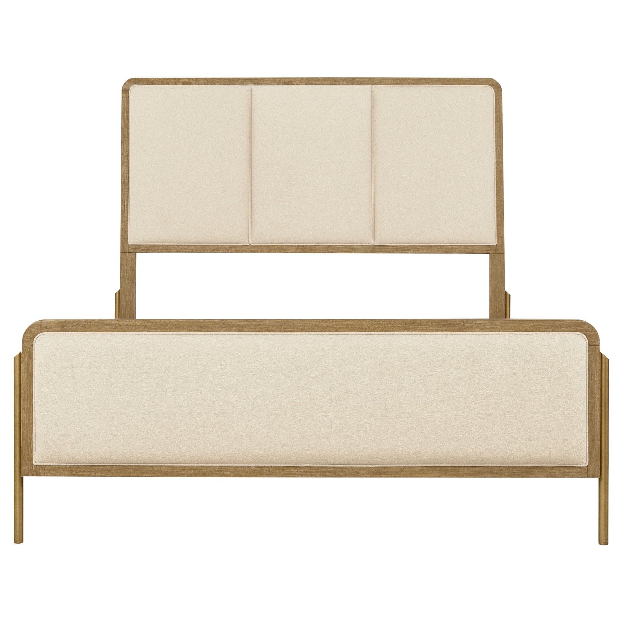Elevate your coastal bedroom with this stunning panel bed, designed with retro-inspired elements and luxurious details. Cream fabric upholstery on the headboard and footboard is framed by a sleek black edge, creating a bold contrast and soft texture. The aged brass metal legs introduce a metallic accent that enhances its glamorous appeal. Crafted from Asian hardwood, plywood, engineered wood, and ash veneer, this bed combines durability and sophistication for a timeless centerpiece.
