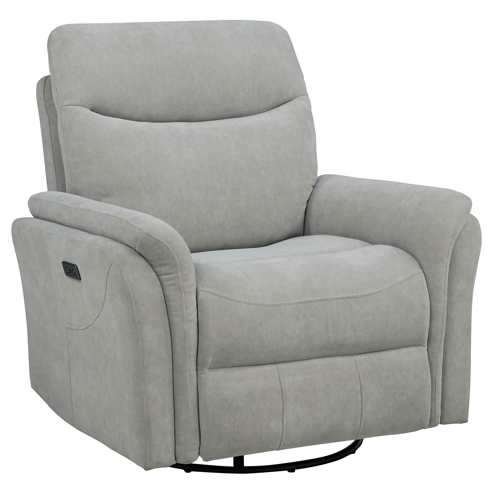 Relaxation meets innovation in this power swivel glider recliner, designed for effortless comfort. A smooth power recline mechanism lets you find your perfect position, while a built-in control panel with USB-A and USB-C charging keeps devices powered within reach. Upholstered in soft fabric over plush foam cushioning, it features gentle gliding and 360-degree swivel motion for versatile lounging. Ideal for modern living rooms, nurseries, or reading corners. Key Features: • Swivel glider recliner features power recline for effortless, adjustable comfort • Upholstered in soft ivory fabric with plush foam cushions for all-day relaxation • Smooth glider base combines with 360-degree swivel for full-range motion • Control panel includes dual USB ports (USB-A and USB-C) for device charging • Durable frame crafted from plywood for lightweight strength and support • Perfect for living rooms, nurseries, or compact lounge spaces with modern needs