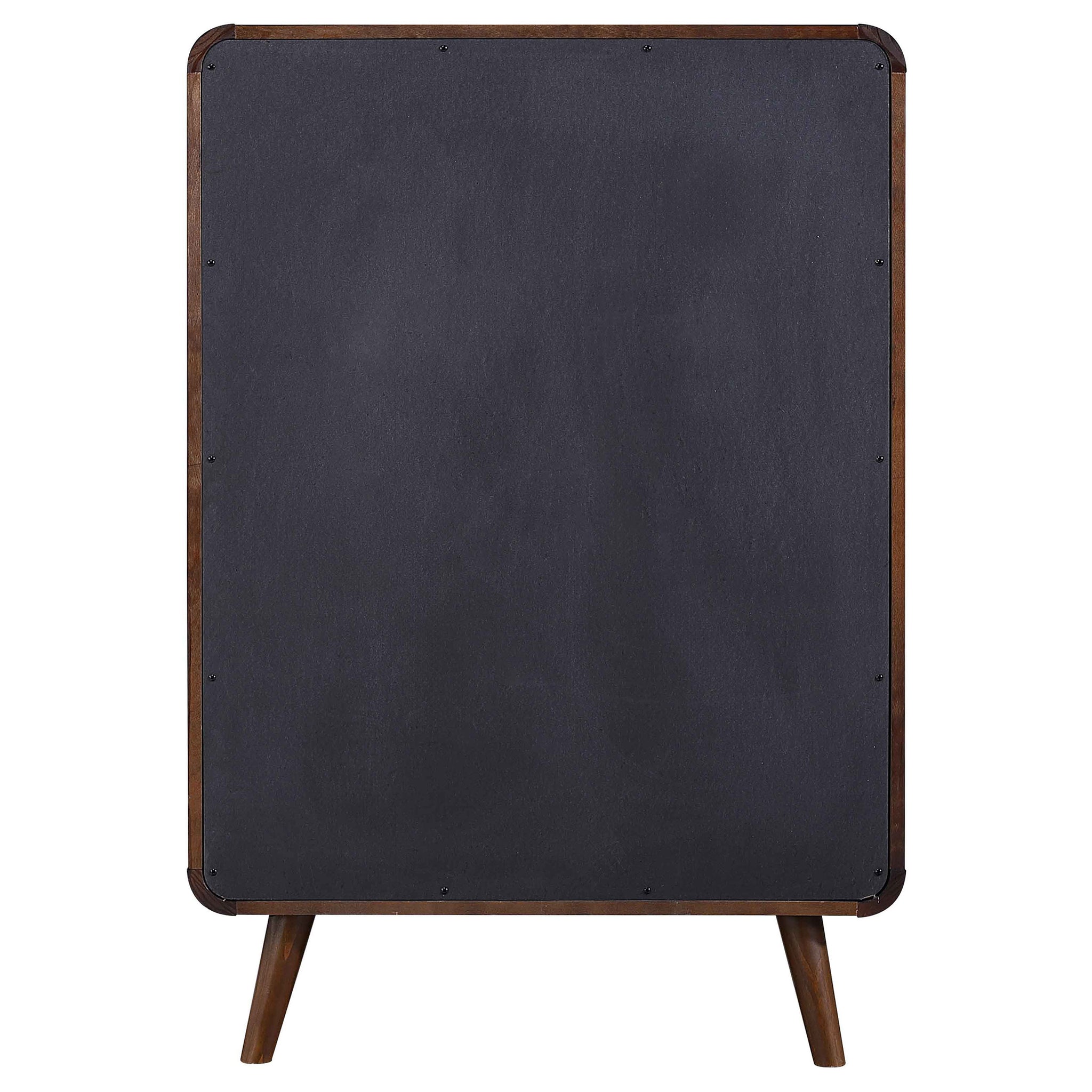 Stylishly organize your wardrobe with this mid-century modern chest of drawers, built with pine, engineered wood, and walnut veneer for durability and style. Featuring five spacious drawers, it offers ample storage for clothing and accessories. Rounded edges and tapered legs lend retro flair, while felt-lined top drawers add a touch of functionality. Smooth drawer glides and subtle metallic hardware complete this elegant storage piece. Key Features: • Five-drawer chest with a dark walnut finish for a bold look • Rounded edges and tapered legs enhance retro-inspired charm • Felt-lined top drawer provides safe storage for valuables • Pine, engineered wood, and walnut veneer construction ensures sturdiness • Metallic hardware adds a polished finishing touch • Smooth-gliding drawers offer effortless access