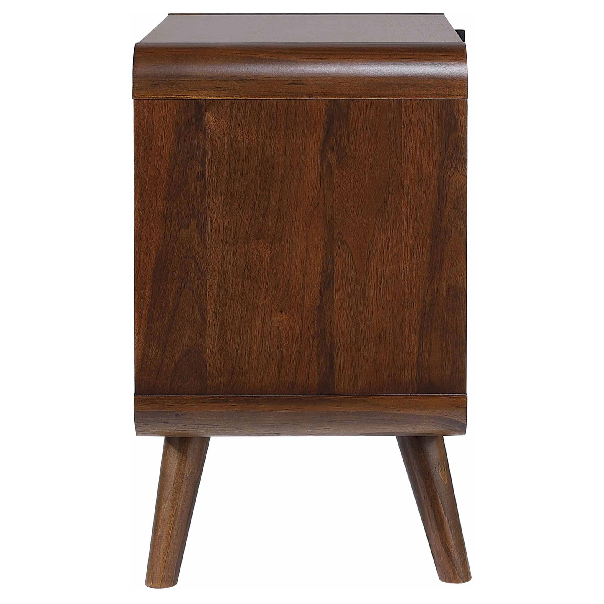Enhance bedside functionality with this mid-century modern nightstand, crafted from pine, engineered wood, and walnut veneer for lasting durability. Featuring rounded edges, tapered legs, and a sleek silhouette, it adds a touch of retro sophistication to your space. Two spacious drawers, including a felt-lined top drawer, provide ample storage for nighttime essentials, while dual USB ports make it easy to charge your devices at the bedside. Key Features: • Two-drawer nightstand with a rich dark walnut finish • Rounded corners and tapered legs exude retro charm • Felt-lined top drawer protects delicate items like jewelry • Dual USB ports for convenient bedside device charging • Made from pine, engineered wood, and walnut veneer for durability • Smooth-gliding drawers ensure effortless operation