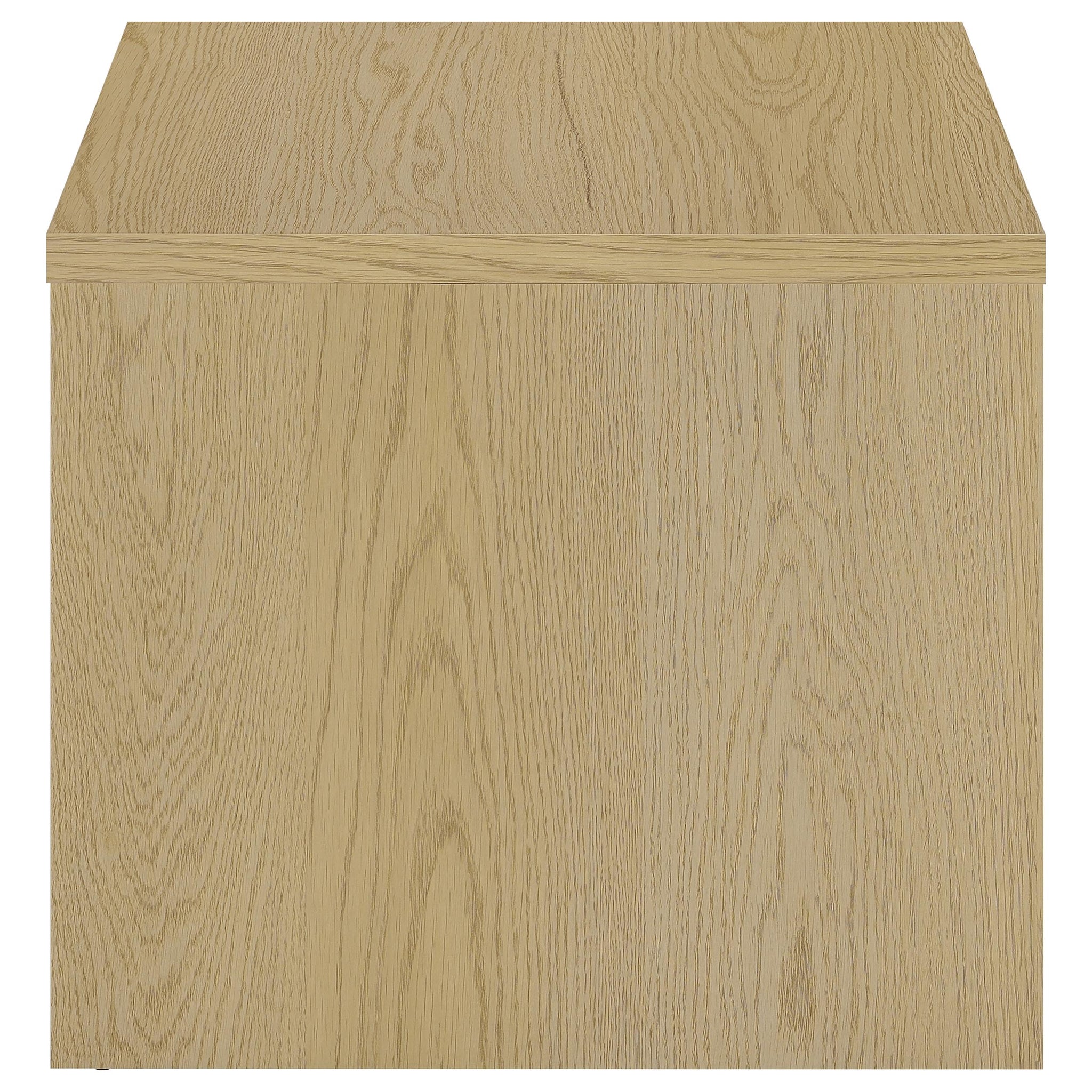 Rooted in simplicity, this end table offers a quiet, grounded presence with a warm finish and clean, geometric silhouette. The open U-shaped frame creates visual lightness while providing a sturdy surface for books, lighting, or decor. With its minimalist profile and natural wood grain texture, this table adds a layer of organic warmth to any modern space. Built from engineered wood with a durable veneer, it balances form and function in effortless harmony. Key Features: • End table with modern U-shaped frame and clean geometric silhouette • Light oak finish highlights a natural wood grain pattern for warm appeal • Flat top offers space for a lamp, books, or decorative accessories • Open sides create visual simplicity and allow easy placement beside seating • Crafted from engineered wood with a durable melamine veneer for everyday use • Ideal for modern, minimalist, or transitional living room and bedroom settings