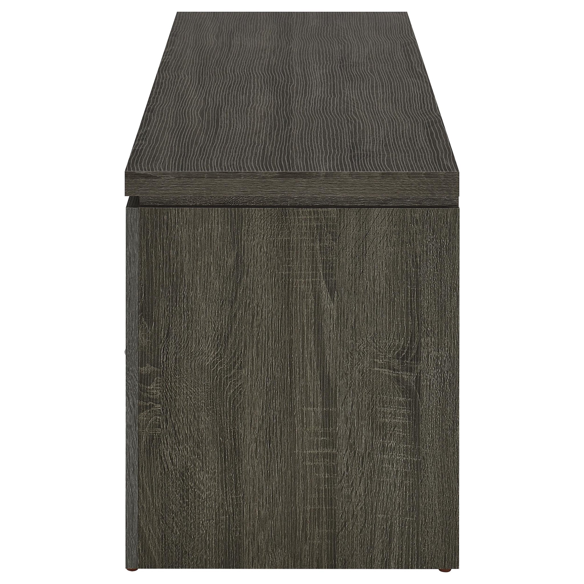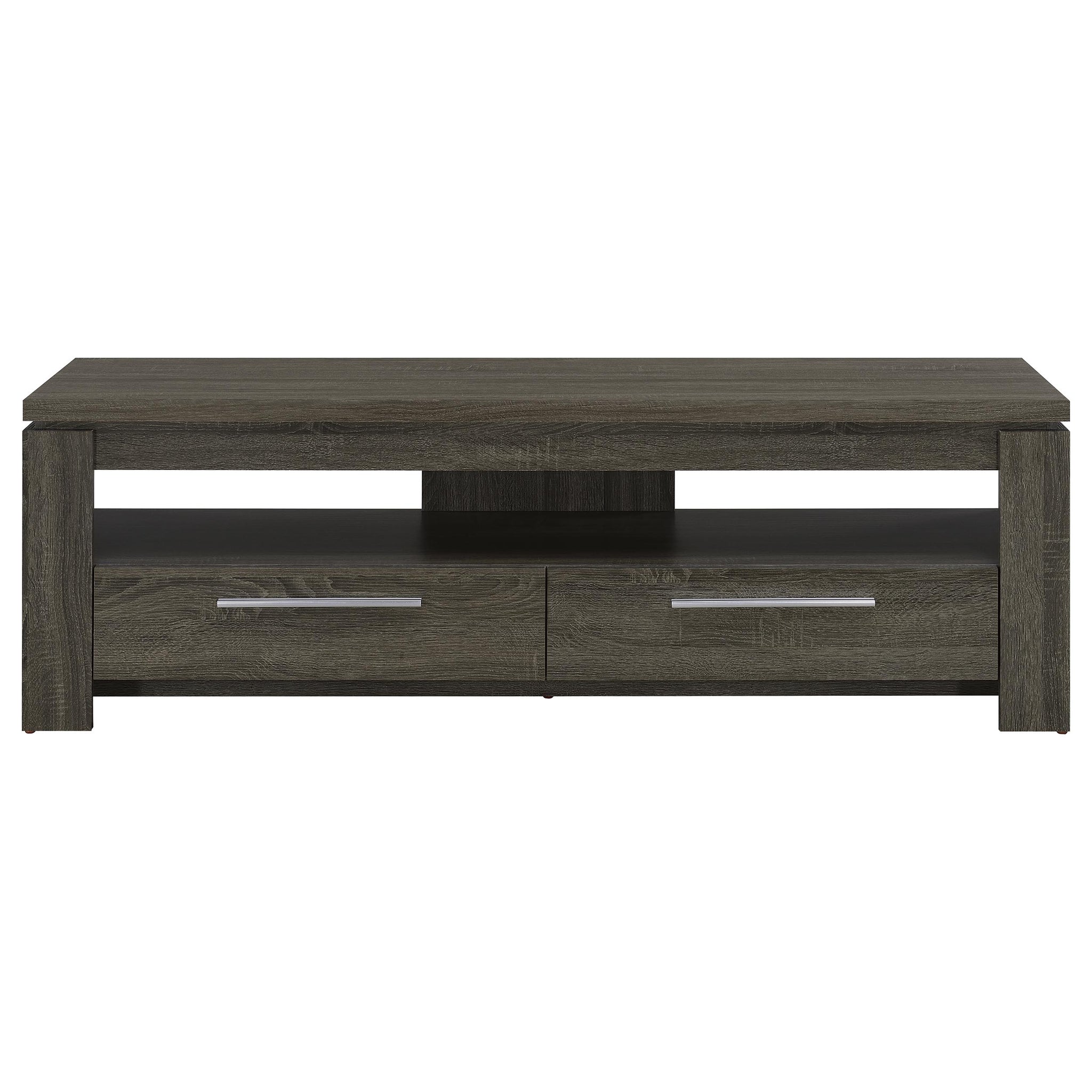 Immerse yourself in the rustic allure of our sturdy TV stand, a harmonious blend of function and aesthetics. Crafted with a rich mango finish, its character is accentuated by rough sawn distressing and layers of warm colors, infusing your space with a touch of vintage charm. Beyond its captivating design, this stand is a testament to thoughtful craftsmanship. It boasts a spacious storage compartment, flanked by two smoothly sliding drawers fitted with euro drawer glides, ensuring easy access. The bold black metal pull handles stand out, providing a striking contrast and ease of use. This TV stand is not just furniture; it's a statement of timeless beauty and functionality. Key Features: • Rich mango finish with rough sawn distressing and layers of warm colors for a vintage charm • Spacious storage compartment and two smoothly sliding drawers with euro drawer glides for easy access • Bold black metal pull handles for a striking contrast and ease of use • Sturdy construction for a testament to thoughtful craftsmanship • Harmonious blend of function and aesthetics for a statement of timeless beauty