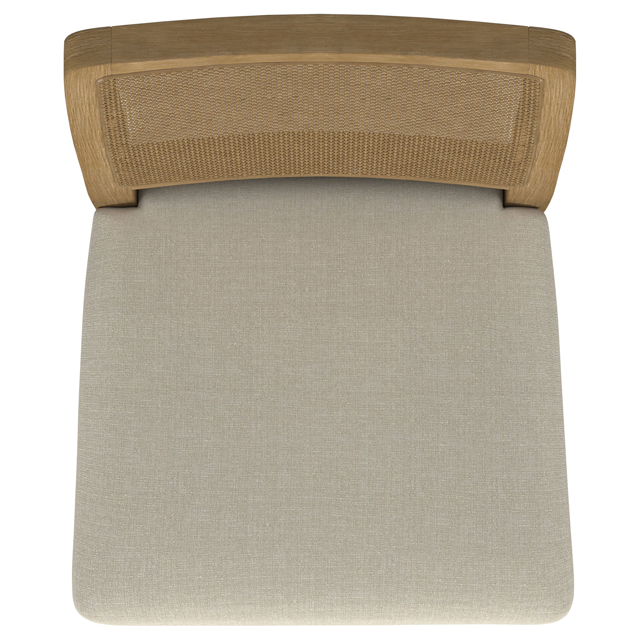 This dining set blends modern craftsmanship with natural textures for a refined yet inviting feel. The dining table features a trestle base with an antique brass-finished metal stretcher bar, adding stability and contrast. Rounded corners soften the rectangular top, while a removable 18-inch leaf allows for flexible seating. The dining chairs feature handwoven cane backrests, solid wood frames, and Pirelli webbed seat cushions upholstered in beige linen-like fabric for lasting comfort and support. A wood grain finish enhances the natural beauty of the materials. Key Features: • Dining set in sand wash finish includes a trestle table and handwoven cane-back chairs for style • Antique brass metal stretcher bar adds structural durability and visual appeal • Table expands effortlessly with a removable 18-inch leaf for extra seating • Handwoven cane backrests enhance texture and bring a natural aesthetic • Foam-padded beige fabric upholstered seat cushions provide lasting comfort and support • Solid wood, white ash veneer, and metal construction ensure strength and longevity