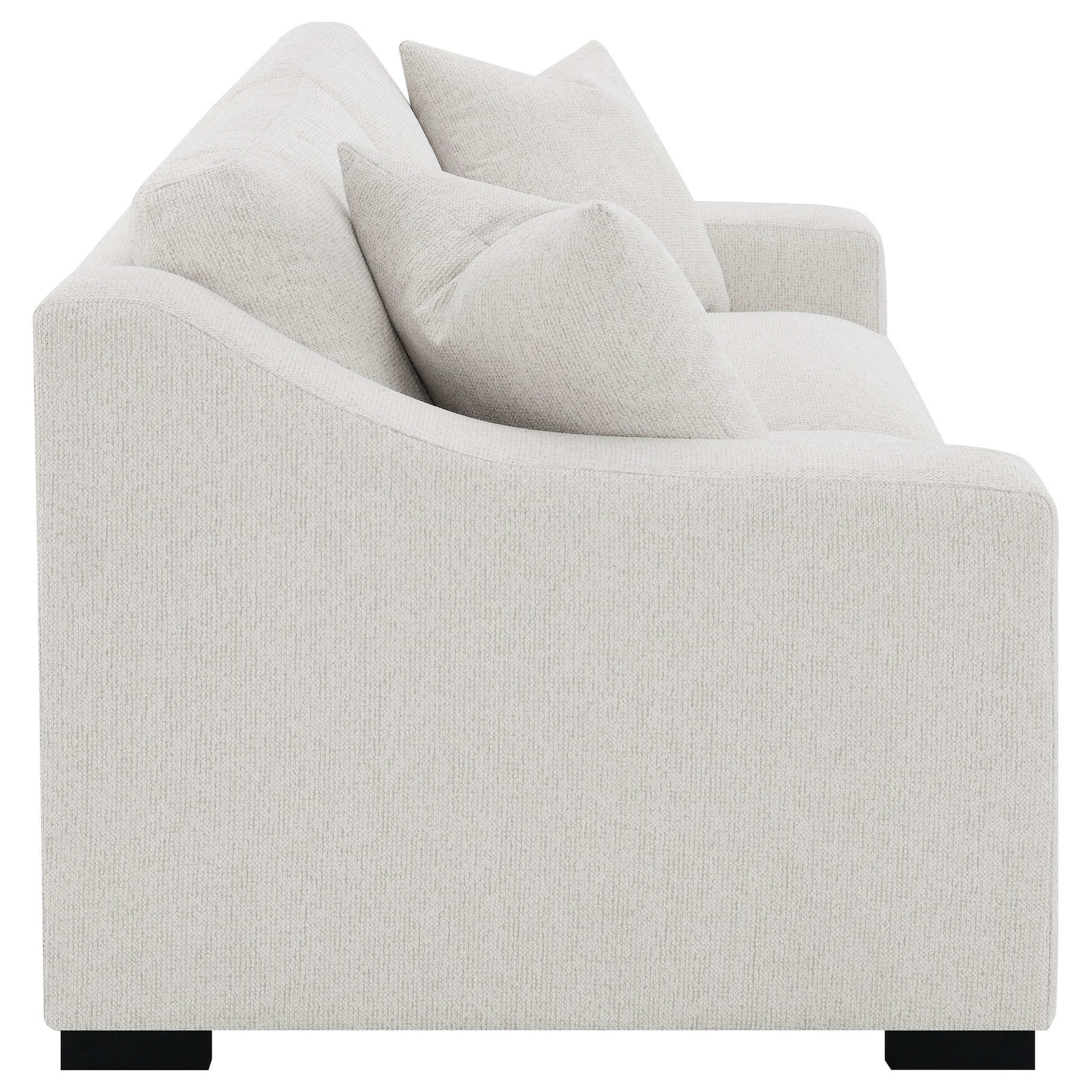 Transform your living room into a clean, contemporary interior with this cheerful, transitional sofa, upholstered in a crisp white trillium polyester blend performance fabric across elegant sloped track armrests and reversible box seat and back cushions with sophisticated top stitching detail. Block style legs in a bold cappuccino finish lend a striking contrast and continue into the solid wood frame that offers additional support and stability. Matching accent pillows present extra comfort and tie it all together. Key Features: • Soft sloped, wide track arms • Relax in trillium filled cushions that create a down-like seating comfort • Reversible seats and backs • Boxed seat and back cushions with top stitching for a tailored look • Wide solid wood legs in cappuccino complement the arm width