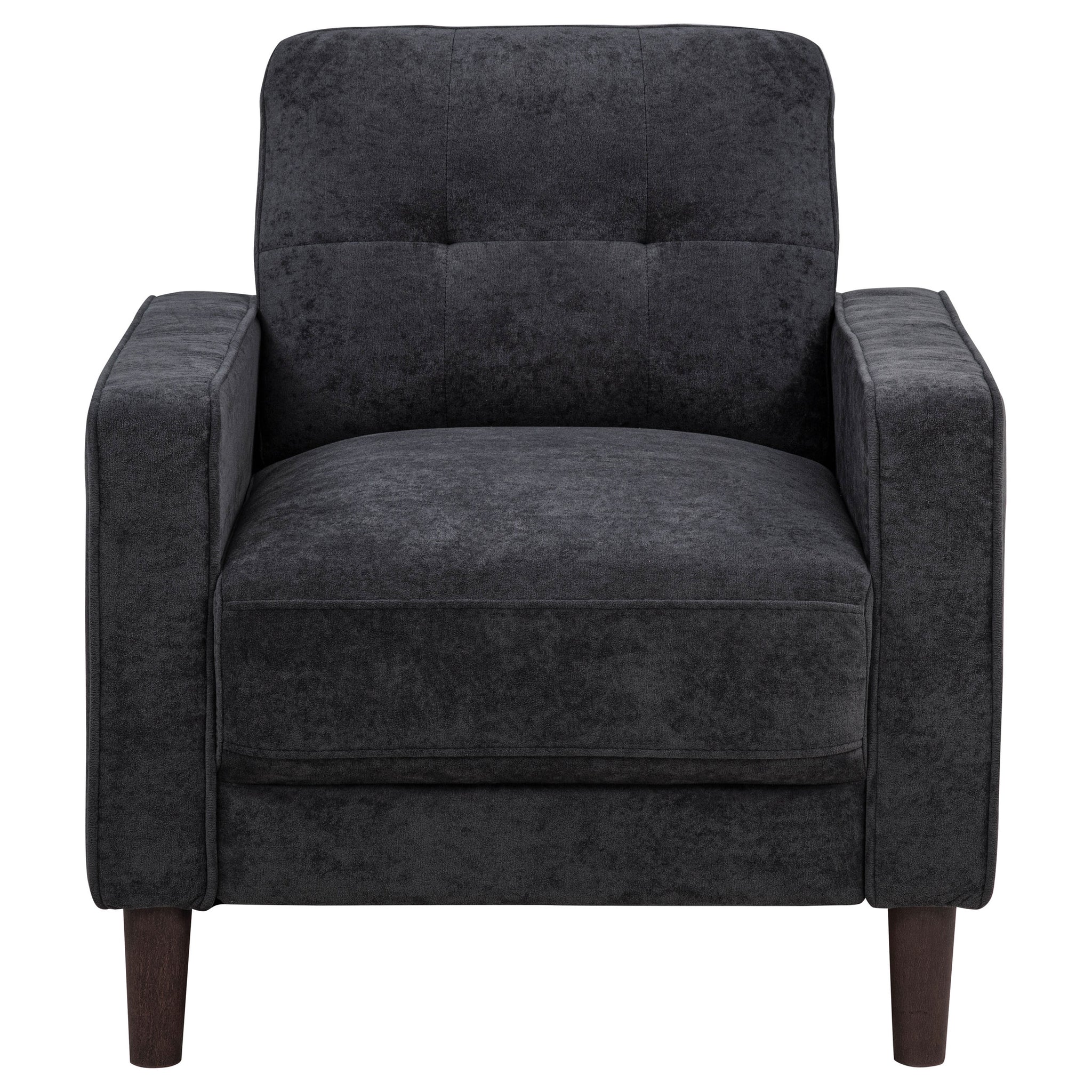 This modern accent chair brings cozy scale and crisp structure to any compact space. Wrapped in soft, textured upholstery, it features slim track arms with cord welt trim and a grid-tufted back for tailored charm. A pocket coil seat offers long-lasting comfort, while tapered round legs provide a stable, elevated base. Perfectly sized for apartments, bedrooms, or reading nooks, this chair delivers a refined yet inviting presence. Key Features: • Accent chair with slim track arms and tailored grid-tufted back cushion for refined comfort • Rust upholstery adds soft texture and a modern neutral tone for any small space • Cord welt trim outlines the frame and seat with crisp, polished detail • Pocket coil seat construction offers firm support and enduring comfort • Soft polyester fabric is smooth to the touch and easy to care for in daily use • Tapered round legs deliver lifted stability and a sleek, mid-century inspired look