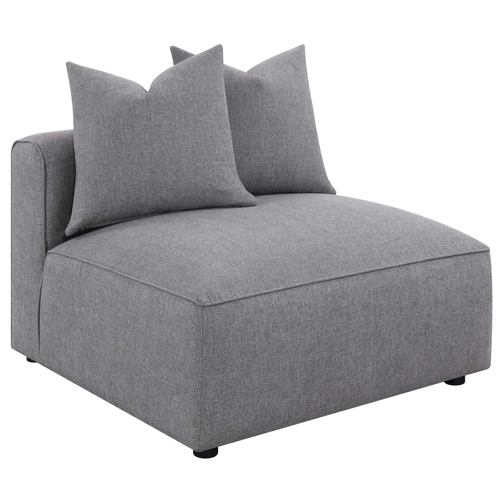 Gather around this large sectional sofa, featuring six modular pieces that invite you to rearrange it as needed for company and parties. Thick wide bases with waterfall edge-like profiles are accented with welt trim for a sleek tailored aesthetic. Perfect for accompanying your existing decor, the softly textured grey woven fabric offers a neutral and monochromatic color palette, welcoming fellow neutrals or adding a backdrop to vibrant colors. Matching pillows make up the back cushions, leaning back into track style armrests and backs. An ottoman easily transitions from a chaise lounge to a coffee table instantly. Key Features: • Six-piece modular sectional in grey fabric for versatile living room seating arrangements • Tailored welt trim accents the wide bases for a refined and modern sectional design • Thick cushions and plush matching pillows provide comfort for family and guests • Grey woven upholstery offers a soft feel and neutral backdrop for any interior • Black legs feature non-skid grip protectors for stability on smooth floor surfaces • Constructed with fabric, foam, larch, plywood, and plastic for lasting durability