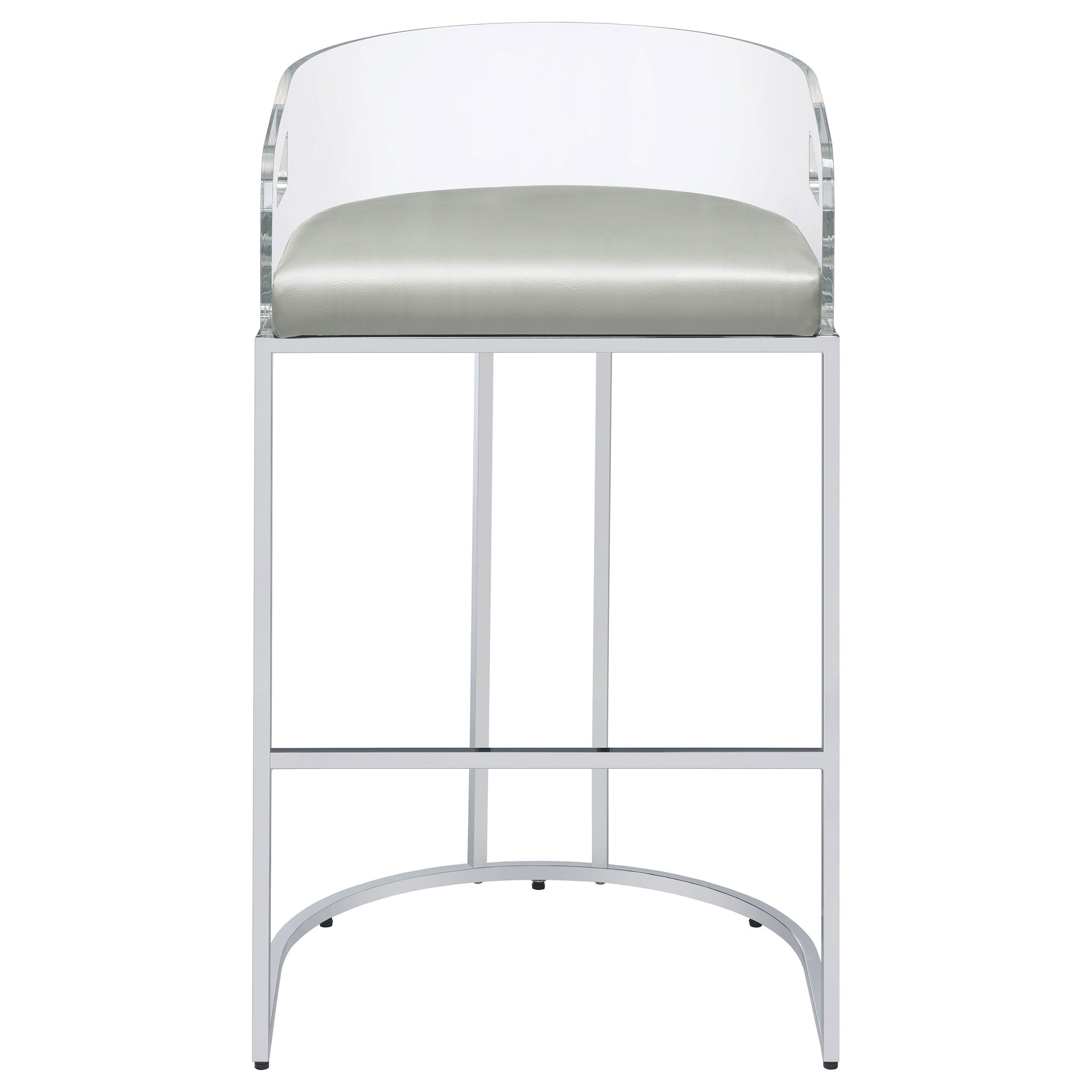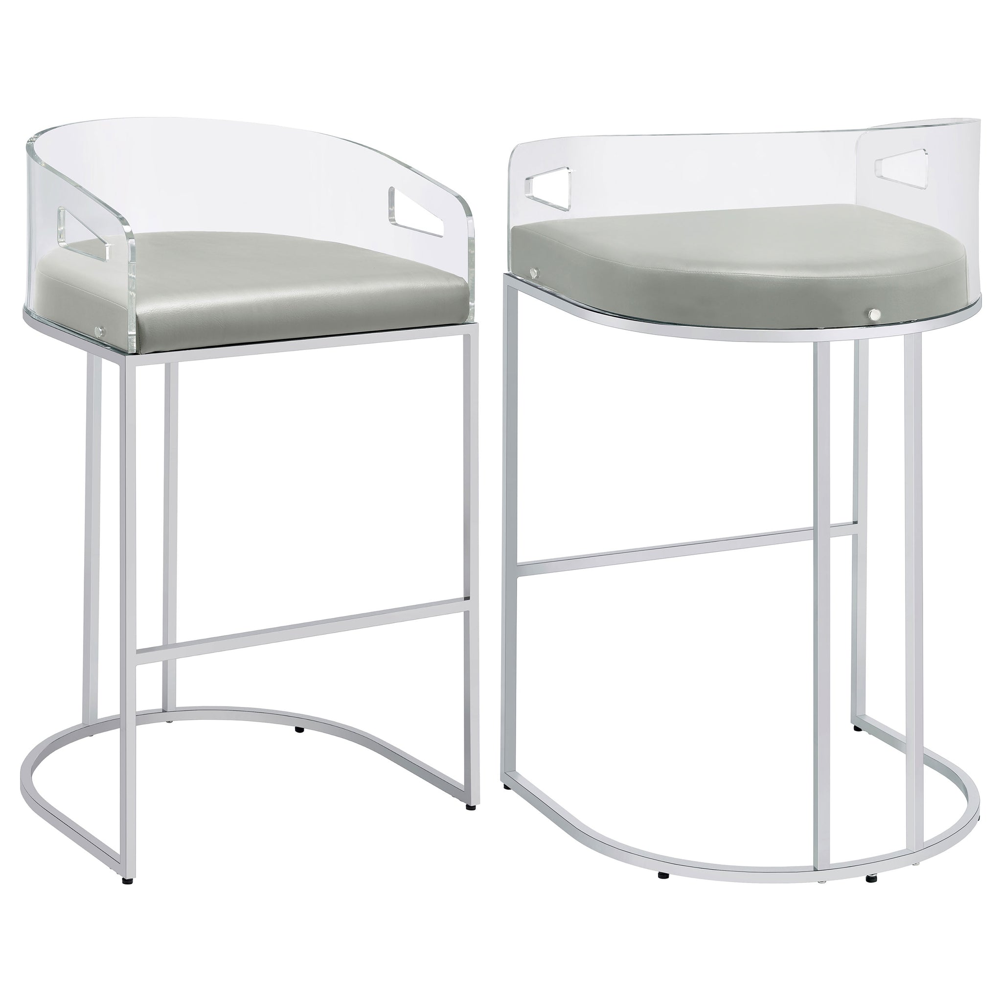 Ultra-modern with a retro-inspired vibe, this pair of stools make a striking piece to a dining room space. With a curved backrest in a clear acrylic material, each stool offers an open and airy design. Rest comfortably on a leatherette cushion as you dine or sip a cocktail. In addition, each stool is supported by a slim metal legs in a lustrous chrome finish and a base shape that mimics the rounded acrylic backrest. Pull up a pair of these stools to a kitchen bar or complete a compact home bar. Key Features: • Ultra-modern with a retro-inspired vibe, these stools feature a curved backrest in clear acrylic and leatherette cushion for comfort • Slim metal legs in a lustrous chrome finish and a base shape that mimics the rounded acrylic backrest provide support • Ideal for a dining room, kitchen bar, or home bar • Open and airy design offers an airy feel • Lustrous chrome finish adds a touch of glamour