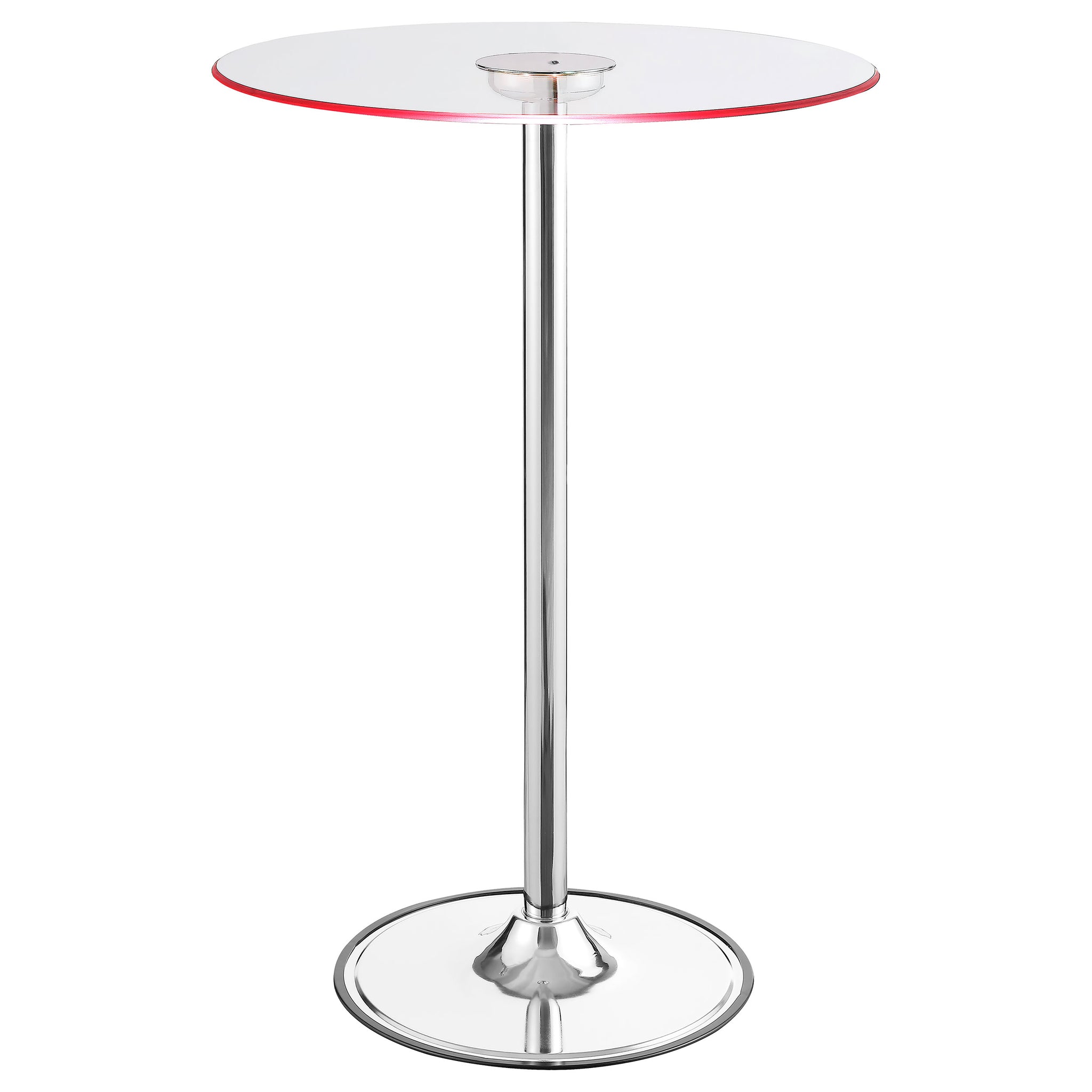 Modern appeal is evident in each and every contour of this contemporary bar table. Its pedestal base boasts a gleaming chrome finish and rounded foot. A petite tempered glass table top is clear, adding to a clean, minimalist presentation. The glass table top is further adorned with transitioning LED lights. Perfect for a compact breakfast nook or a happening home lounge. Key Features: • Contemporary round LED bar table with chrome electroplated pedestal base • Clear tempered glass table top • Bar table features transitioning LED lights: Red, blue, green, magenta, yellow, and aqua (batteries not included) • Metal construction