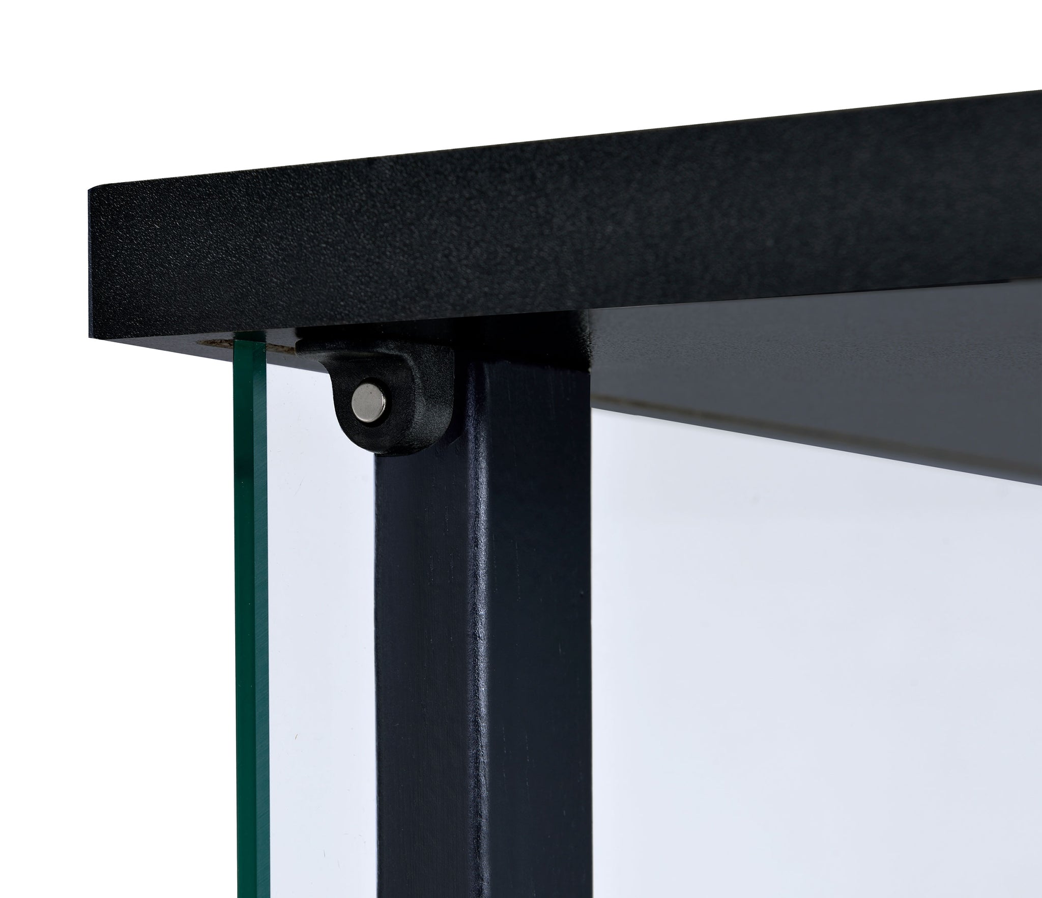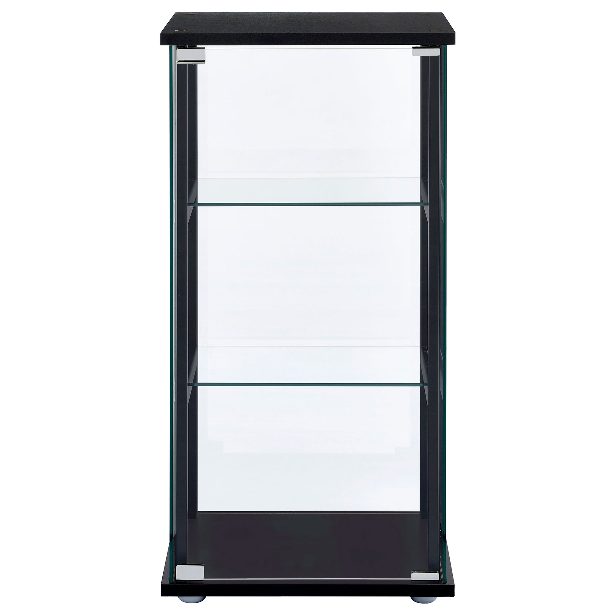 A modern version of a true classic makes a fabulous addition to a transitional space. With linear styling and a fresh look, this curio cabinet offers a perfect venue for showcasing treasured decor. Bold black tops a simple frame, top, and base. Tempered glass shelves create transparent space for display. Access its interior easily with push-to-open doors. Key Features: • Modern curio cabinet in black finish • One reversible magnetic push-to-open clear tempered glass door provides ease of access and strength • Three tiers of shelving for additional display space • Available in a variety of sizes • Glass, pine, particle board, and laminate construction