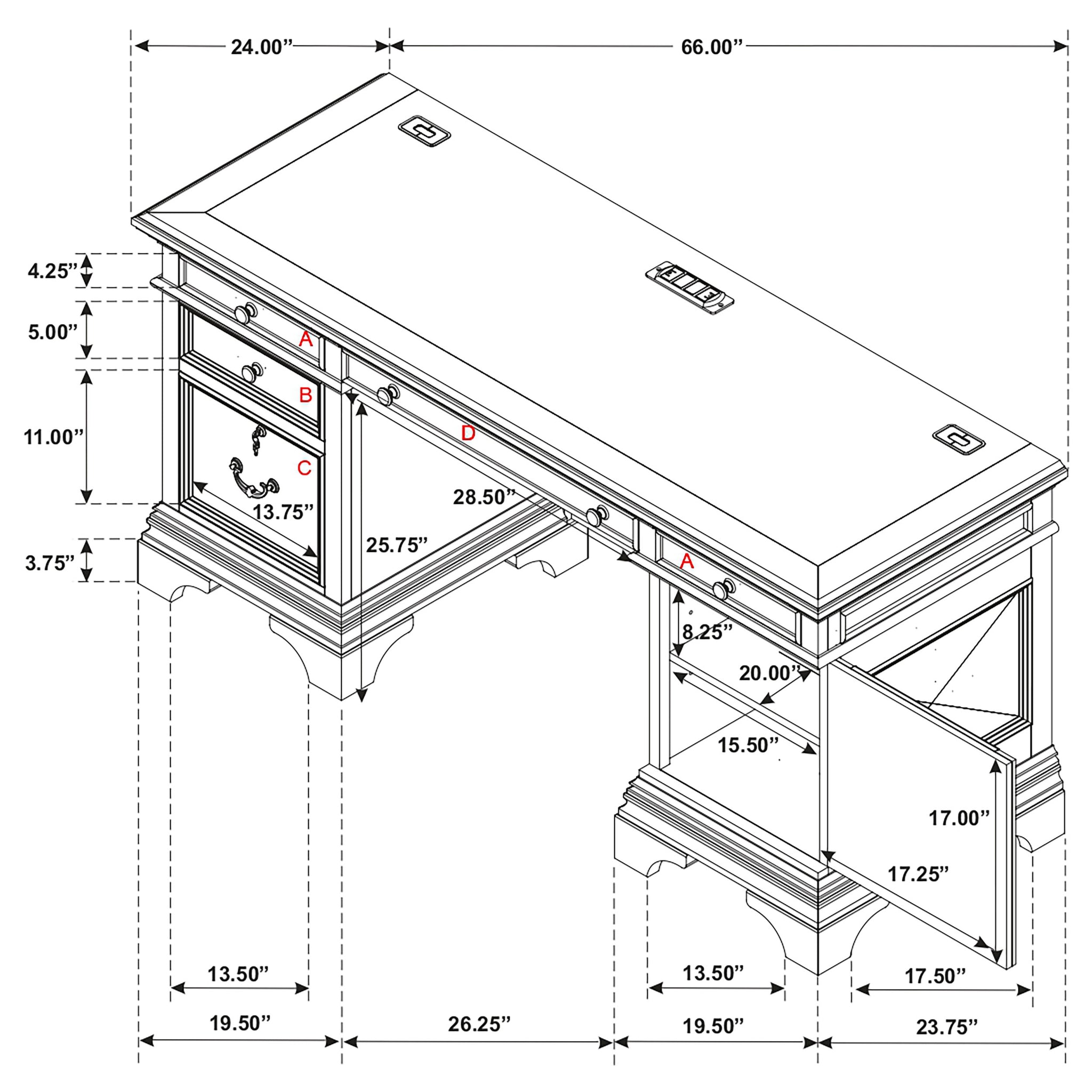 This burnished oak credenza with hutch is bound to enhance your office space. Stately and traditional in style, there is plenty of storage space with five drawers, two top cabinets, and two lower cabinets that lock for safekeeping. Crown molding detailing and paneling make for a magnificent display. Supportive bracket style feet provide stability and an attractive upgrade for this wood credenza. Include this piece in your traditional style office space. Key Features: • Executive home office collection finished in burnished oak • Features felt lined top drawers, 45mm full extension ball bearing glides, and bronze hardware • Credenza includes a power outlet (2AC/2USB), center keyboard drawer, two top drawers and middle drawer with removable dividers, one lockable file cabinet, and a cabinet with an adjustable shelf • Hutch includes a single drawer, two cabinets with clear tempered class door panels, and two adjustable shelves • Constructed with rubberwood, plywood, MDF, particle board, and white oak veneer