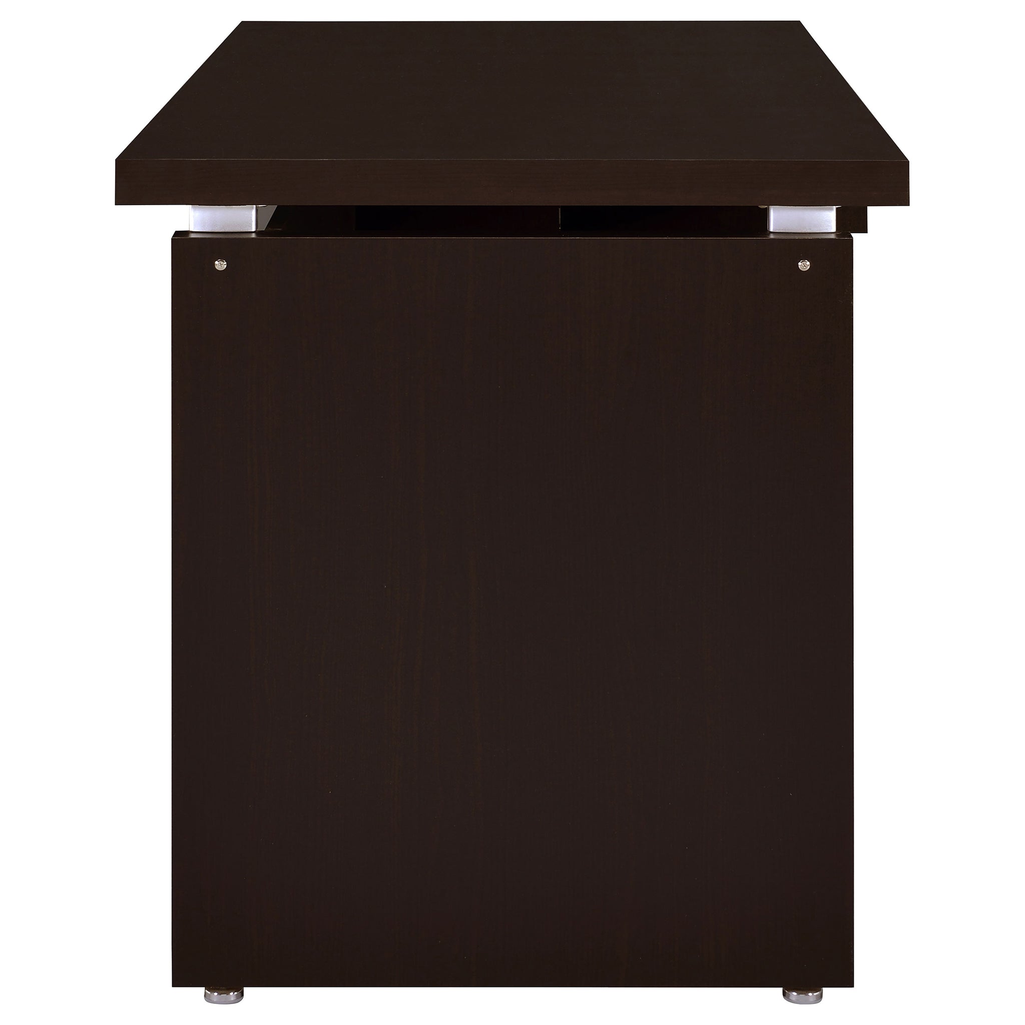 This modern computer desk blends sleek design with practical features for a sophisticated workspace. Constructed from durable engineered wood with a wood-look laminate veneer, it offers both style and functionality. The floating top design adds a contemporary flair, while the keyboard tray provides easy access to essential devices and accessories. Finished in a rich, versatile tone, this desk is perfect for home offices, providing a clean and minimalistic aesthetic with ample work space for your computer, documents, and more. Key Features: • Sleek computer desk with a contemporary floating top design for modern style • Built from engineered wood with a wood-look laminate veneer in a cappuccino finish • Features a convenient pull-out keyboard tray for easy access to your devices • Offers ample workspace for computers, documents, and office supplies • Simple, clean lines make it ideal for both home and office environments • Sturdy construction ensures lasting durability and stability for daily use