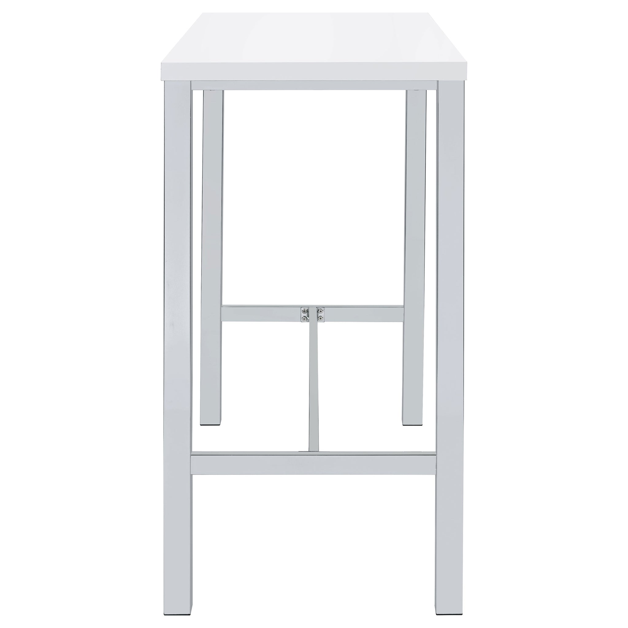Ultra-modern with a clean lined silhouette, this five-piece bar set comes complete with a rectangular shaped bar table and four bar stools. Perfect for more contemporary home, the table comes with sleek and square legs made and a steel frame in an electroplated and polished chrome finish that lends a luxurious gleam to any room. The tabletop features a high gloss white lacquer finish and seats four people comfortable. Each stool also features a matching lustrous high gloss white seat and matching legs. One the stools are also footrests for extra support and stability.