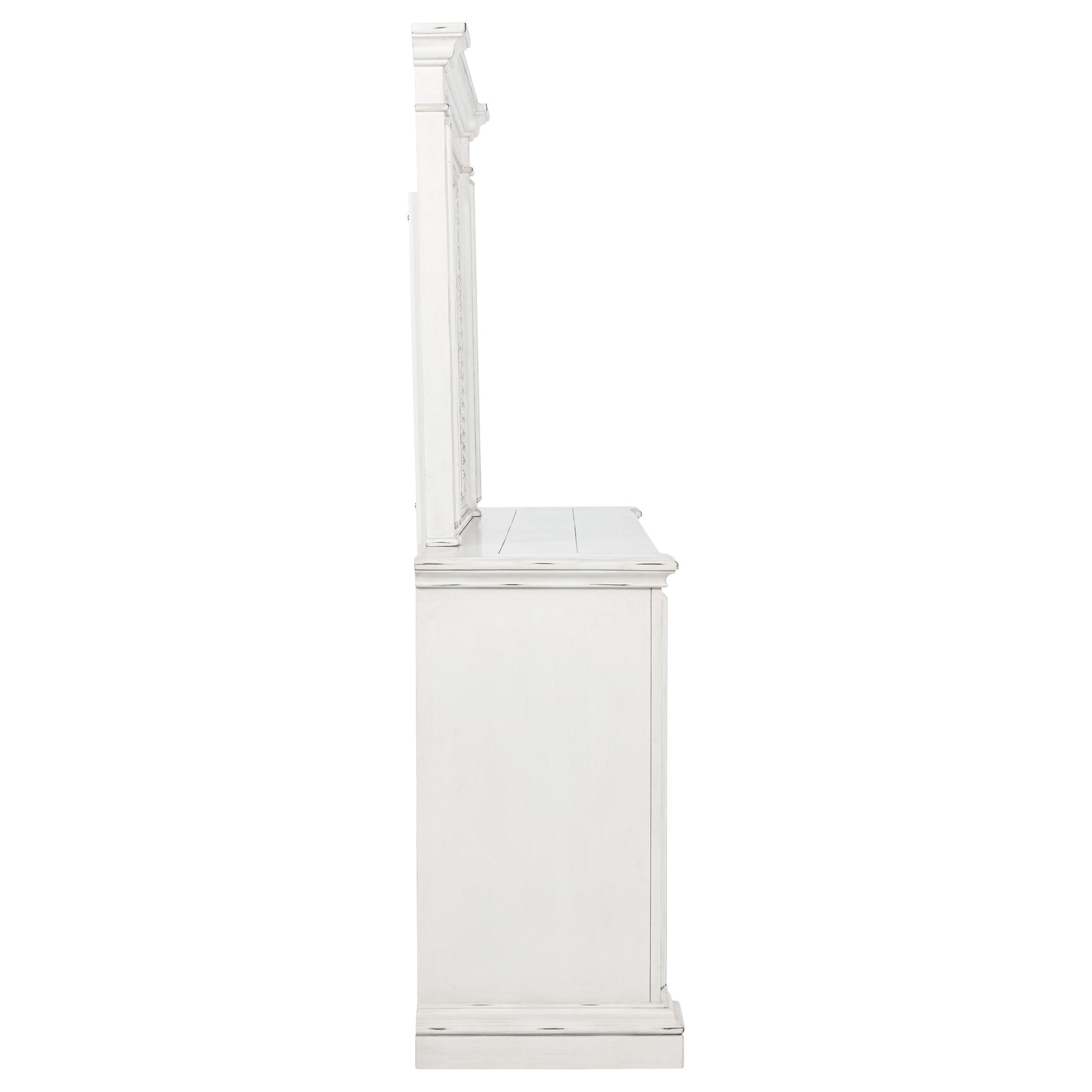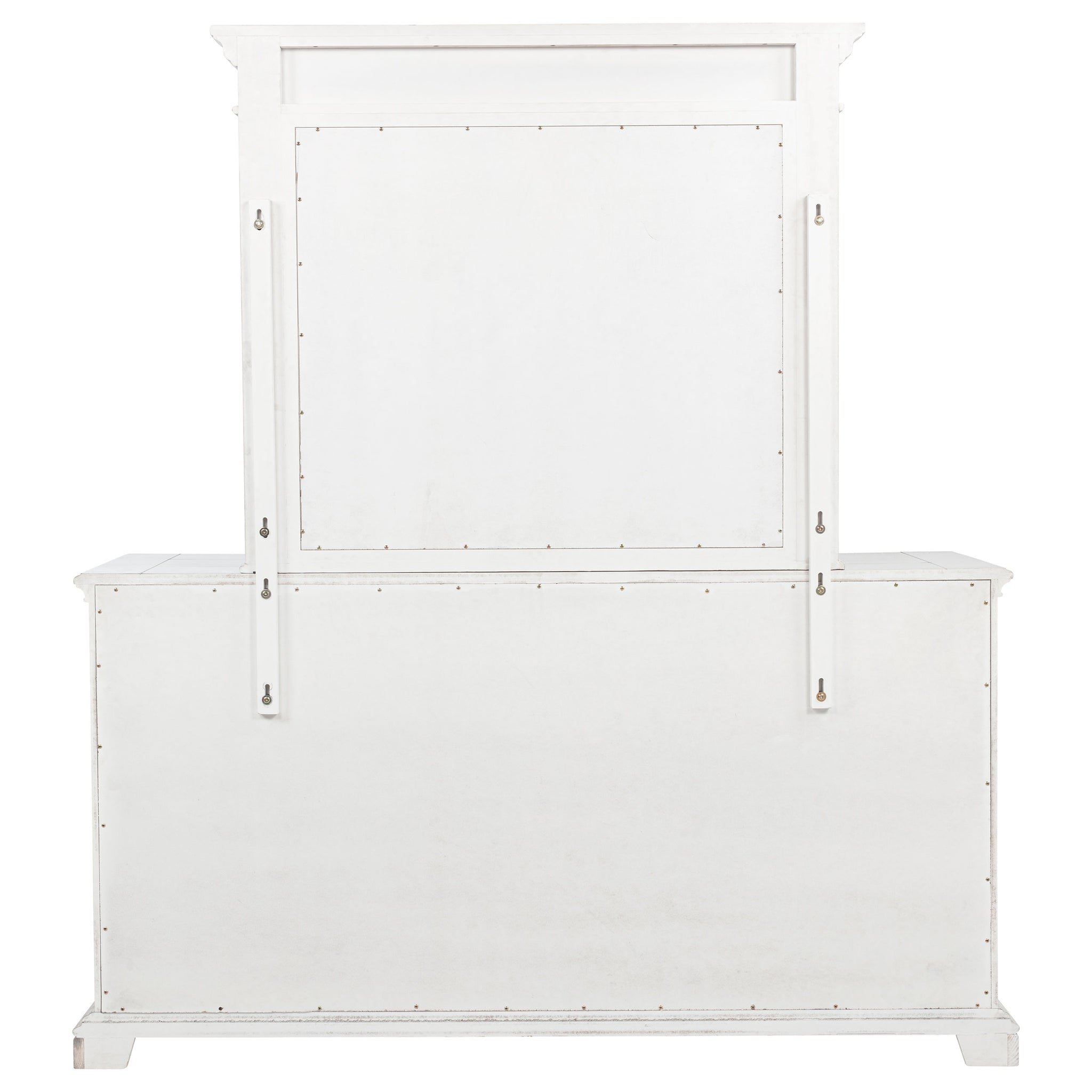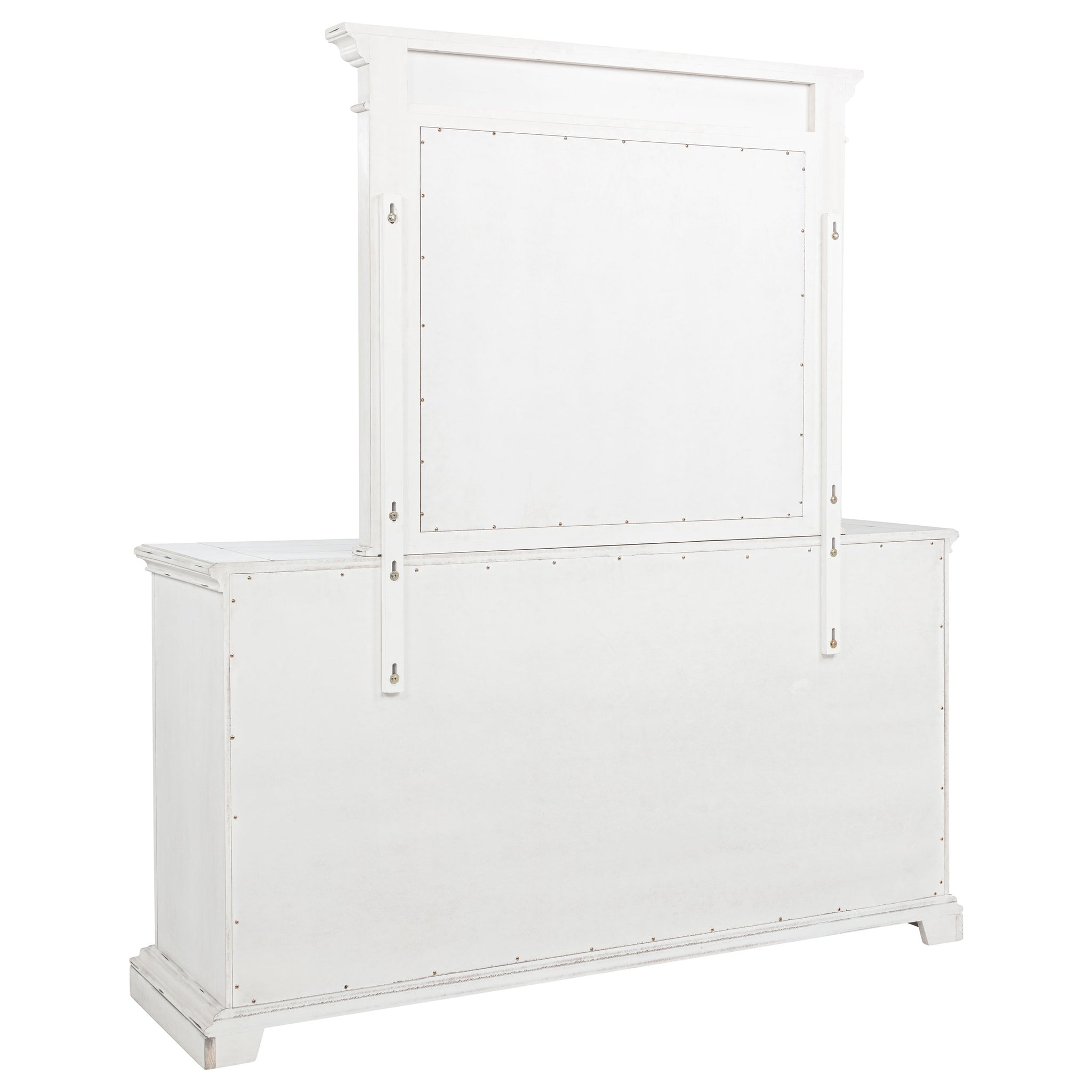Rooted in traditional elegance, this dresser and mirror set brings vintage charm and refined detail to the bedroom. Framed with ornate carvings and softened by a distressed white finish, the six-drawer dresser offers ample storage with thoughtful touches—including a hidden jewelry tray in the bottom drawer. Antique bronze pulls and crown molding complete the look. Crafted from poplar and engineered wood, it’s designed with both beauty and function in mind. Key Features: • Six-drawer dresser and mirror set with ornate trim and traditional crown molding • Vintage white finish offers aged character with soft, antique-inspired appeal • Antique bronze drawer pulls provide contrast and decorative visual weight • Bottom drawer includes hidden jewelry tray for organized, concealed storage • Felt-lined top drawers and smooth glides add elevated function to daily use • Crafted from poplar, engineered wood, and mirrored glass for enduring charm