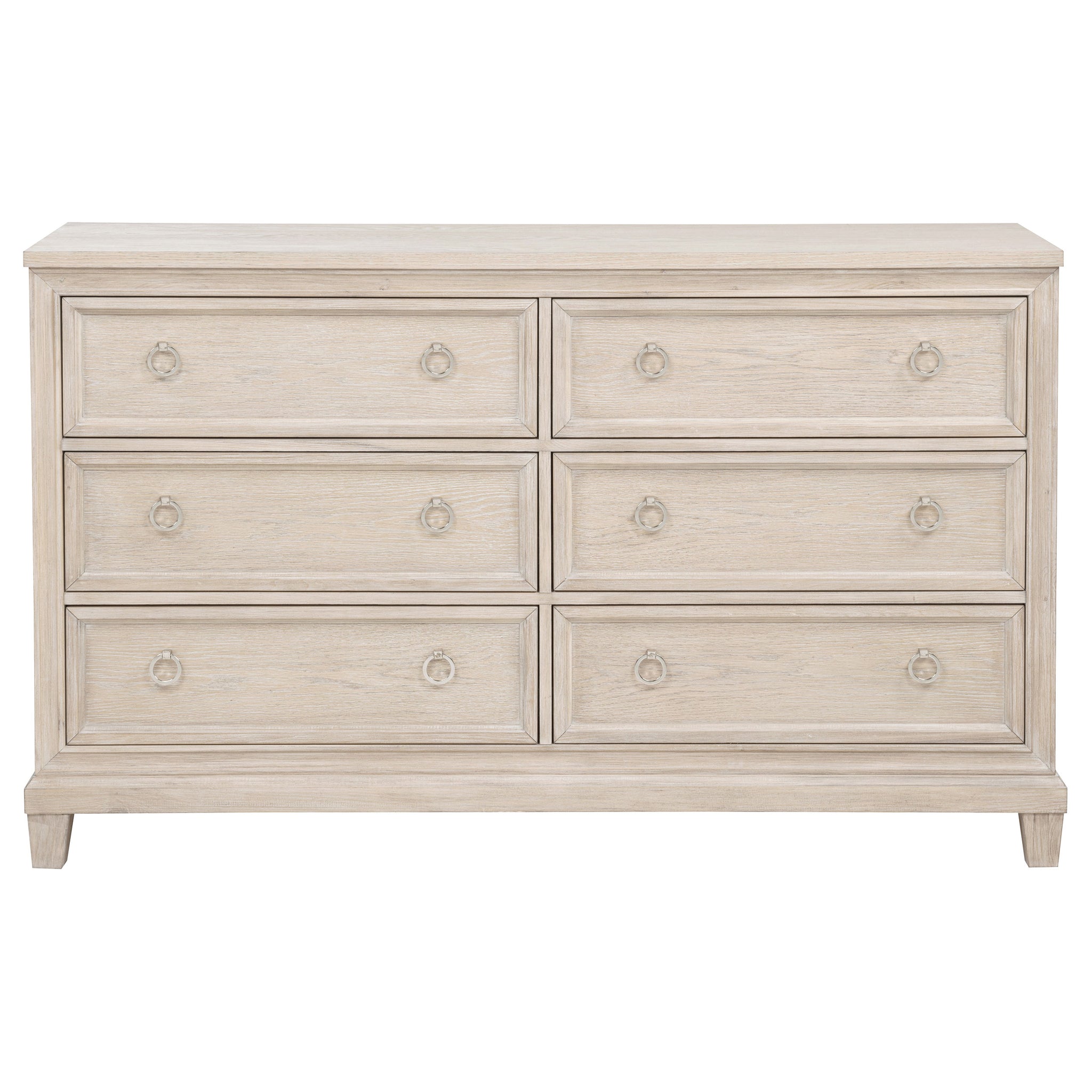 Softly structured and beautifully balanced, this six-drawer dresser brings timeless charm to the bedroom. Framed with clean lines and stepped trim, it offers generous storage behind a refined facade. The washed oak finish reveals natural wood grain, while polished nickel ring pulls add a hint of shimmer. Crafted from poplar, oak veneer, and engineered wood, it brings enduring grace and practical elegance to daily living. Key Features: • Six-drawer dresser with clean lines and stepped trim for classic bedroom appeal • Washed oak finish highlights soft wood grain with breezy natural texture • Polished nickel ring pulls add gentle shine and traditional detail • Spacious drawers offer versatile storage for clothing or linens • Crafted from poplar, engineered wood, and oak veneer for lasting strength • Tip-over restraint included for added safety and everyday stability