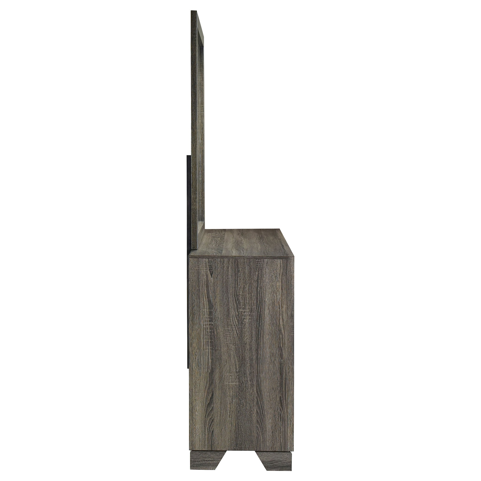 Complete your bedroom storage ensemble with the roomy space in this transitional six-drawer dresser with a framed mirror that attaches directly to the back of the dresser. It boasts a brown oak wood grain finish over laminate surfaces, creating a stylish look that resists everyday wear and tear. The dresser delivers roomy storage in drawer with smooth metal glides and bar pulls, adding the perfect hint of contrast and depth. Mitered trim adorns the front of the case and complements the frame on the mirror to create a sense of angular precision. Use the wide top for a jewelry box and a vase of flowers, or select decor that brings personalized aesthetics to your inviting bedroom. Key Features: • Crisp style enhances the clean lines of a transitional six-drawer dresser with a framed mirror • A brown oak wood grain finish is complemented with metal bar handles that add a touch of contrast • Six drawers create ample storage for clothing, accessories, and personal items in your bedroom • Made from engineered wood with laminate surfaces that resist scratches and dents • Drawers feature center metal extension glides for seamless performance and operation