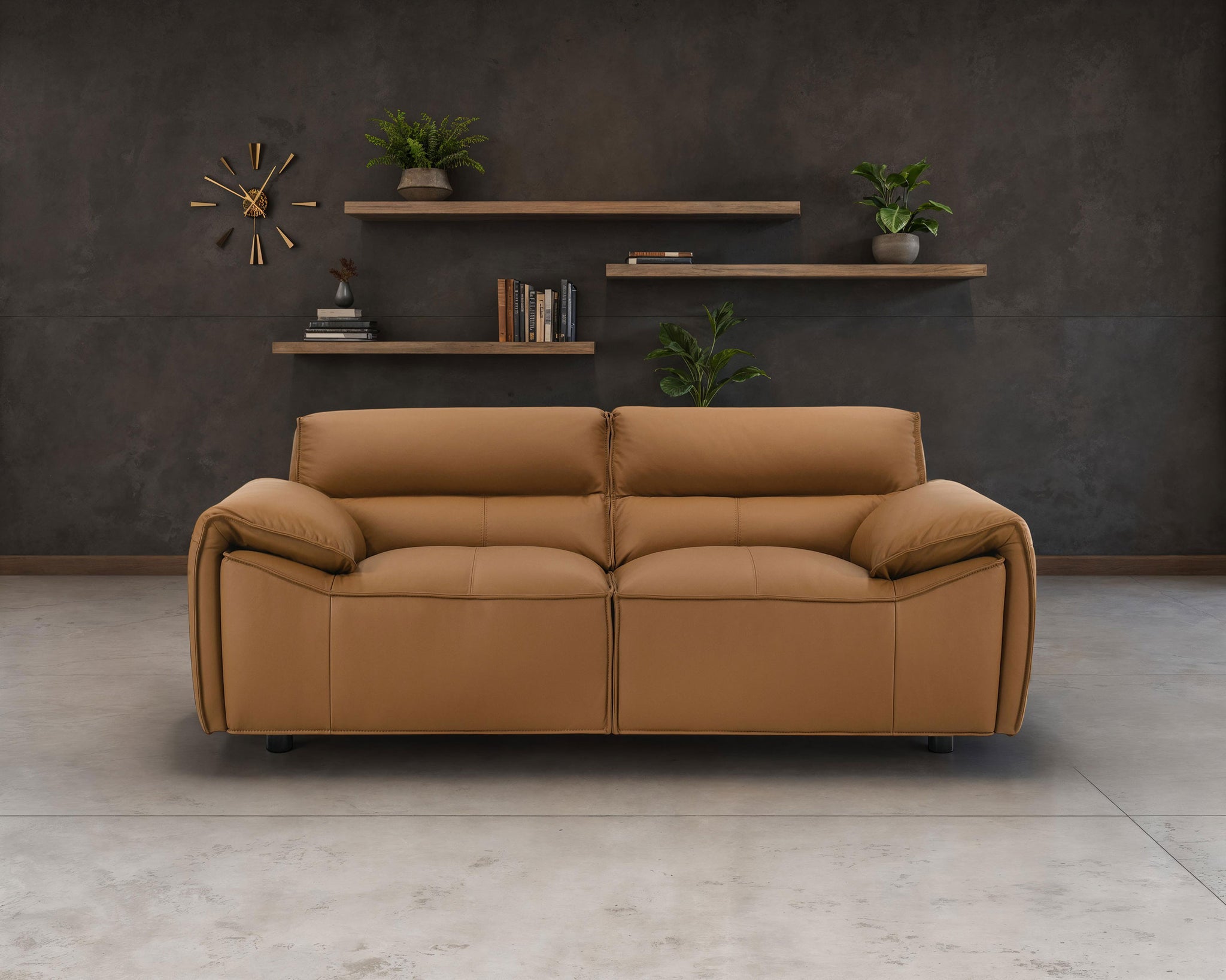 This leather-upholstered loveseat offers a perfect balance of sculptural simplicity and everyday luxury. Wrapped in 100% genuine top grain leather, it showcases smooth tailoring and a bold, low-profile silhouette. Wide, gently sloped arms and deep seats create an inviting feel, while high-density full foam cushions and a sinuous spring foundation provide lasting support. With its grounded form and refined materials, this piece brings quiet sophistication to any modern space. Key Features: • Loveseat upholstered in 100% top grain leather for a soft, luxurious hand and long-term durability • Low-profile frame with wide, sculpted arms creates a relaxed yet structured silhouette • High-density full foam seating offers plush comfort with excellent shape retention • Sinuous spring support system enhances flexibility and long-lasting resilience • Orange leather finish delivers bold contrast and timeless modern style • Perfectly scaled for pairing or standalone use in sophisticated living spaces