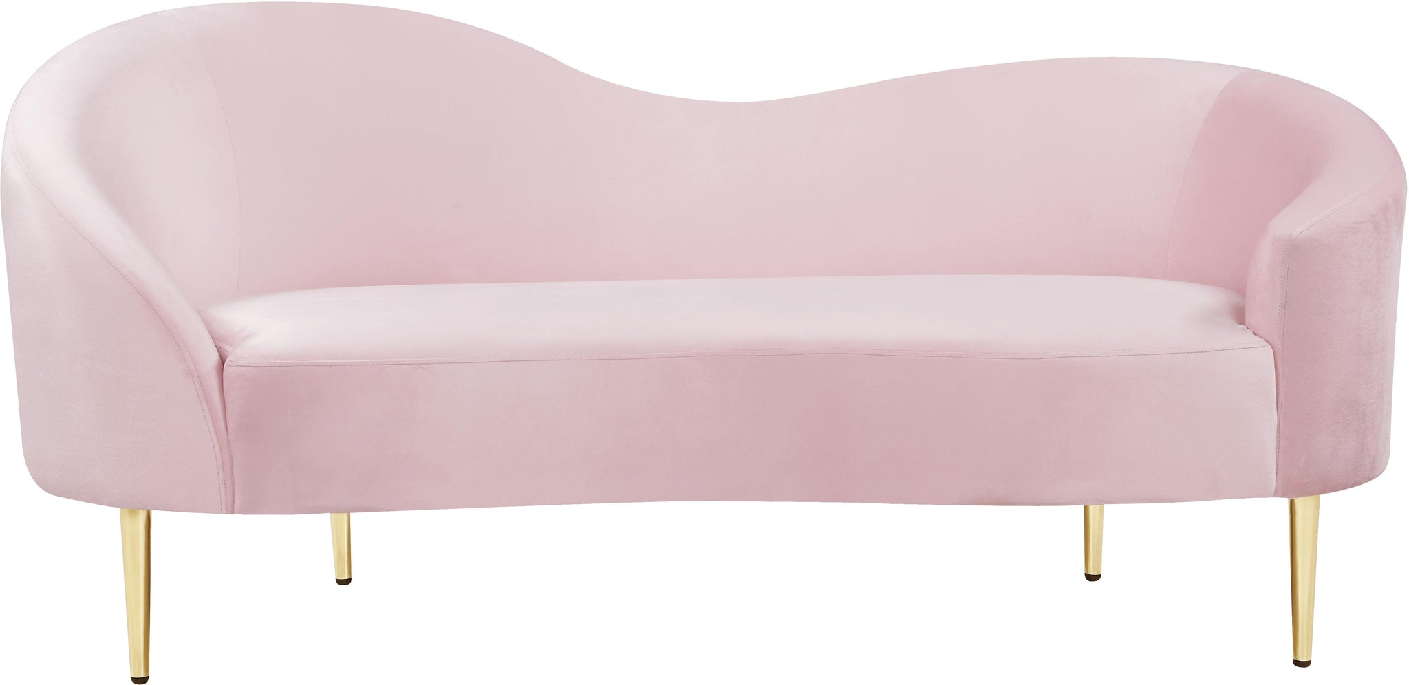 Get comfy while remaining chic in this elegant Ritz pink velvet loveseat. Plush pink-colored upholstery provides a soft texture that is pleasing to the senses, while its curved design offers a contemporary touch to your home furnishing. Gold metal legs complement the loveseat's sophisticated pink color, creating a gallant piece anyone would be proud to display in their home.
