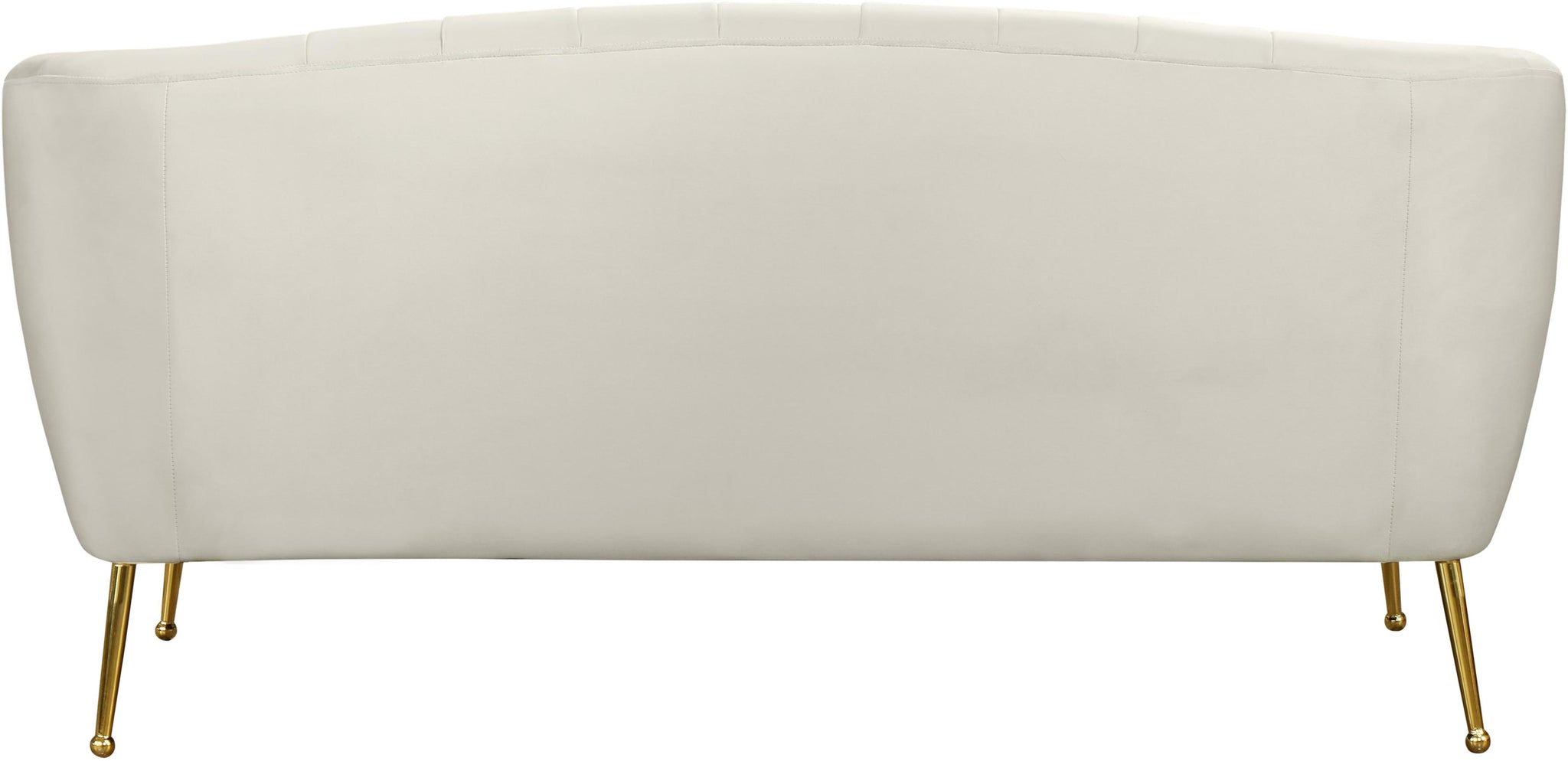 Dress up your living room space with this Tori Velvet Loveseat. This plush loveseat features chic cream velvet upholstery that covers every square inch, adding a sumptuous and svelte look to your room. The gold legs with a ball design on the foot adds to the elegant look of this pretty chair, and deep channel tufting adds loft to the back and arms for a lavish feel when you sit down to relax and unwind at day���s end.