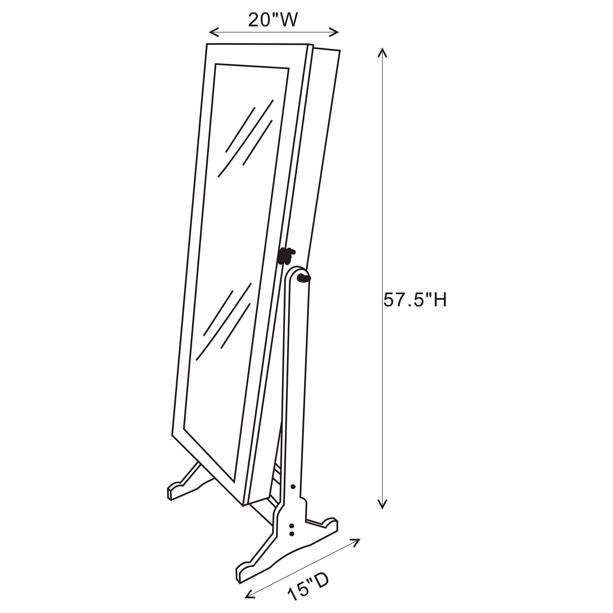 Put the finishing touch on a glamourous bed or dressing room with this stunning floor-length jewelry cheval mirror. Sleek and smooth, the frame features a metallic silver finish. Supportive and intriguing, the delicately curved legs give this mirror its chic personality. Brighten up a space with the light up mirror while keeping your favorite jewelry safe. Angle the mirror upwards or downwards in any bold or neutral decor scheme. Key Features: • Jewelry cheval mirror with LED-lit frame and full-length tilting design • Hidden jewelry armoire includes hooks, ring rolls, and open shelves for storage • Tiltable cheval structure provides adjustable viewing angle for daily use • LED perimeter lighting offers bright, clear visibility while selecting accessories • Freestanding base with curved legs delivers both support and visual appeal • Crafted from engineered wood and mirror for long-lasting functionality and style
