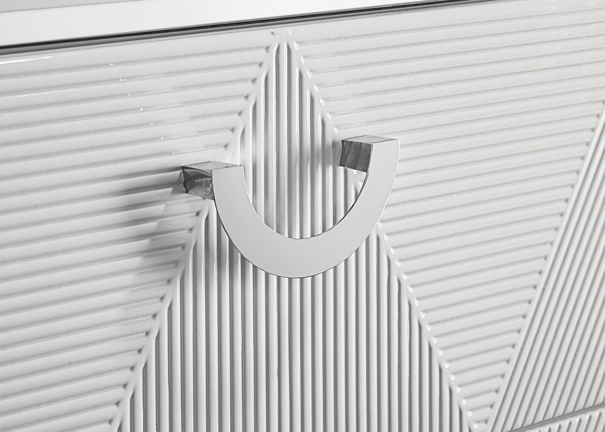 With its sculptural drawer fronts and crisp white high gloss finish, this nightstand brings a fresh, modern edge to the bedroom. Two spacious drawers feature dimensional geometric textures and sleek chrome-finished pulls, while the top drawer is lined in black felt for added refinement. Built-in USB-A and USB-C ports on the back offer convenient charging access. Metal extension glides and polished surface details complete this bold yet functional bedside table. Key Features: • Modern nightstand in white high gloss finish features sculptural geometric drawer fronts • Dual USB charging port includes both USB-A and USB-C access at the back for convenience • Two drawers offer storage with top drawer fully lined in black felt for a refined interior • Chrome-finished drawer pulls complement the bold dimensional pattern and sleek surface • Equipped with 45mm metal extension glides for smooth and quiet operation • Crafted from engineered wood for clean lines and durable everyday use