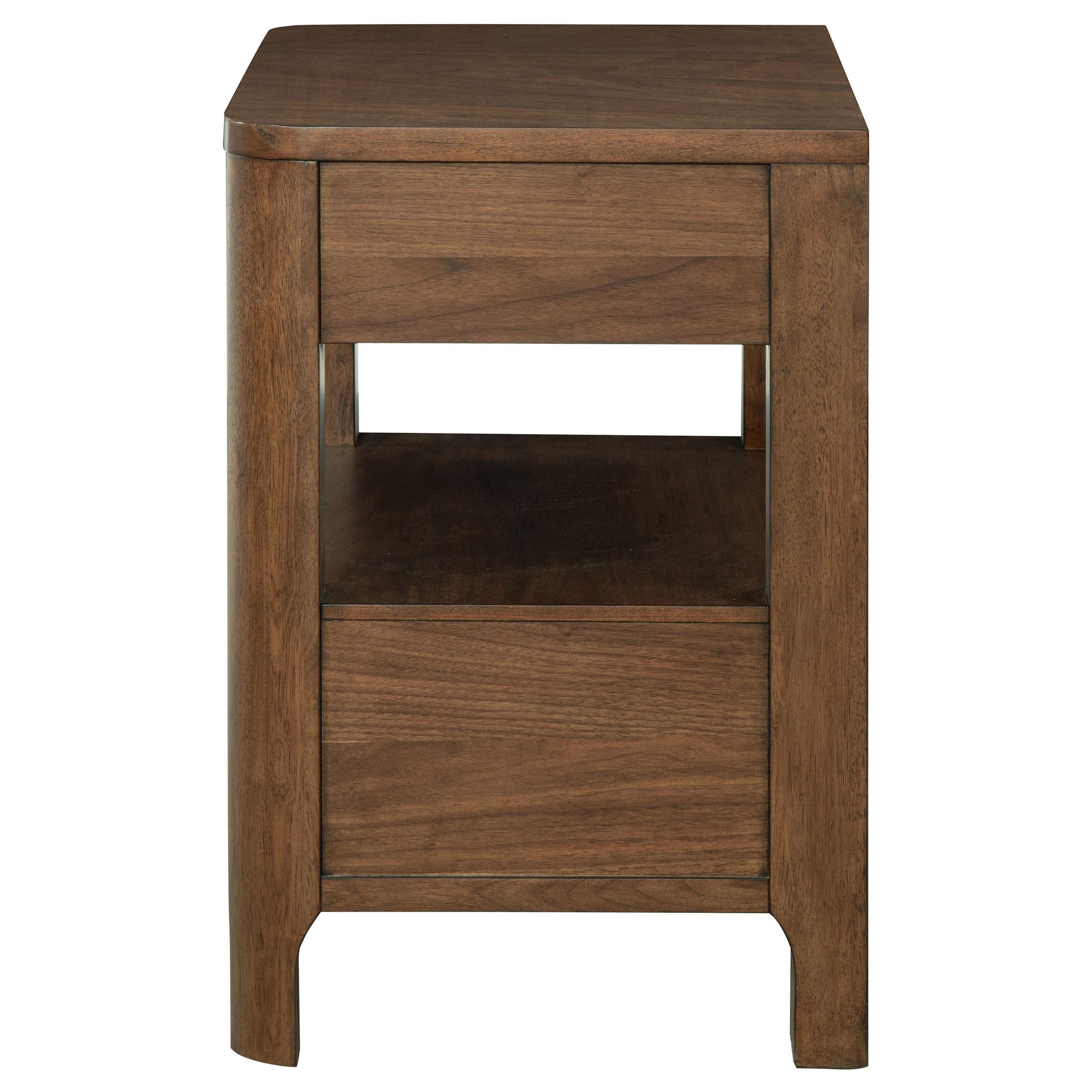 Create a space for reading materials and a table lamp at your bedside with this transitional wooden nightstand. It features two storage drawers with cedar and includes felt lining in the top drawer for added protection. Its open silhouette features a shelf between its two drawers, lending airy flair to your bedroom ensemble. The beside table offers easy storage, while delivering a refined profile complete with rounded corners and legs. Drawer fronts include fingertip pulls with a graceful curve, creating visual depth in any bedroom. Key Features: • Enhance your bedside with the handsome profile and lovely character of a transitional nightstand • Nightstand features rounded corners and two drawers, with a shelf in between, perfect for books • Walnut wood veneer lends warmth and creates a touch of texture with natural grain patterns • Top drawer is complete with dark brown felt lining, offering easy protection for delicate items • Drawers feature cedar lining that helps to protect against pests and provides excellent quality