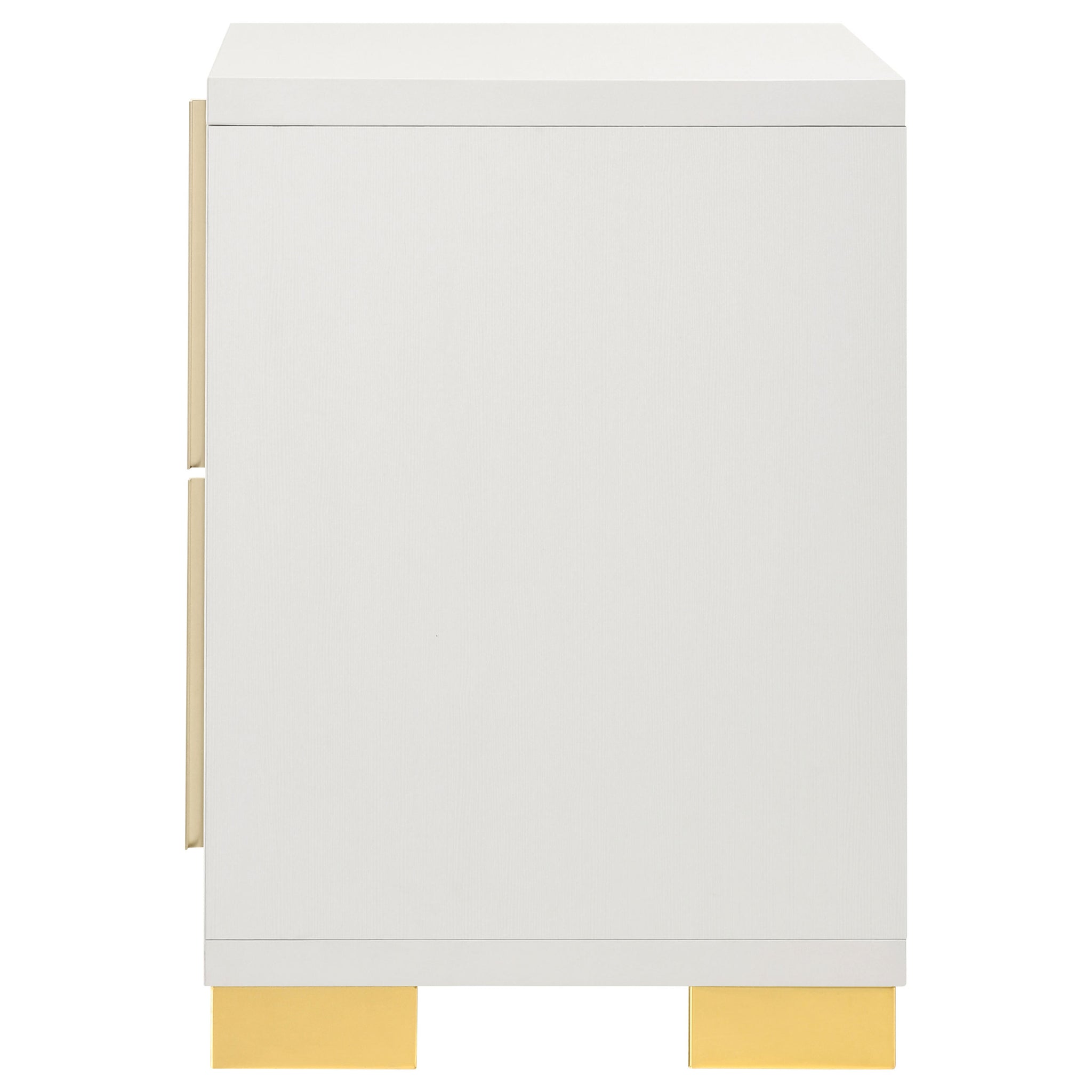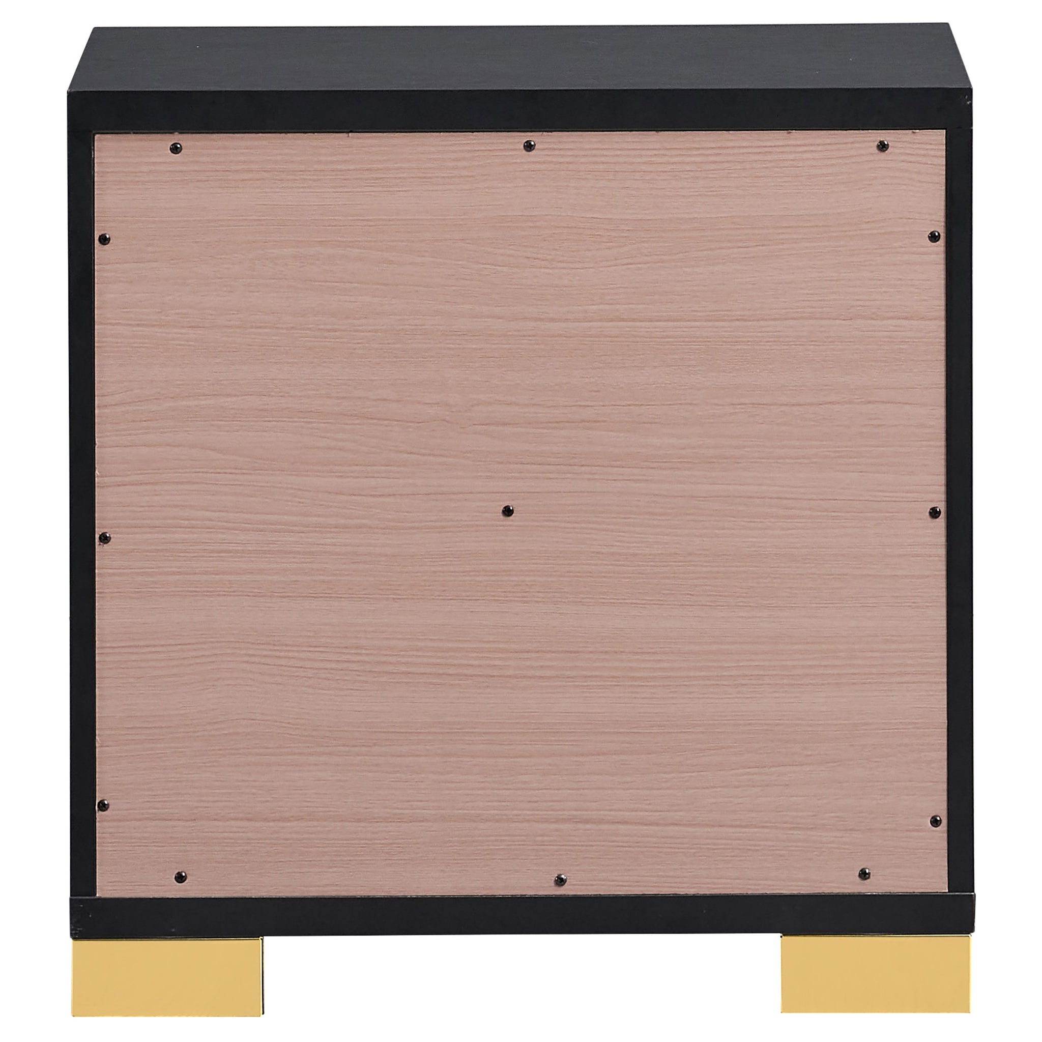 A bold look leans exotic and alluring to transform your master or guest bedroom into an inviting venue. Modern design details produce a chic nightstand with an Art Deco vibe and tons of elegance. Made of wood products, this two-drawer nightstand features a versatile finish with accenting from gold finish metal, placed carefully to emphasize a geometric linear effect. Store incidentals and accessories in two drawers operating smoothly on center metal glides. English dovetail drawer construction embellishes this nightstand’s quality, as vertical gold metal hardware offers a unique impact. Key Features: • Exotic and alluring bold look to transform master or guest bedroom into inviting venue • Modern design details produce chic Art Deco vibe nightstand with tons of elegance • Wood products construction with versatile finish and gold finish metal accents for geometric linear effect • Two drawers operating smoothly on center metal glides with English dovetail drawer construction • Vertical gold metal hardware for unique impact